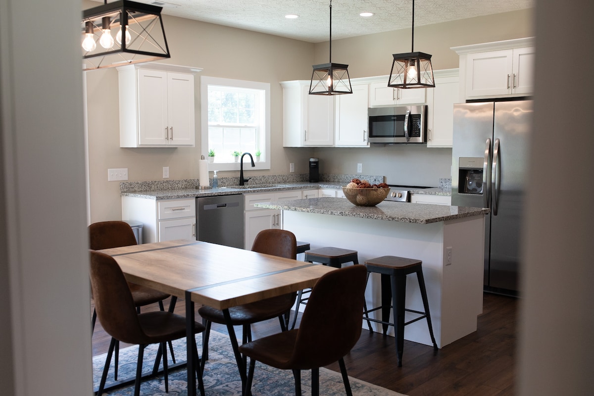 Relax in this peaceful, modern, country cottage with a spectacular view of the Kentucky landscape. This living space is equipped with all the comforts of modern living as well as a spacious backyard and free parking area. It has a master bedroom with a queen-sized bed and an upstairs area with two bedrooms each with a hanging bed. Located in the center of south-central Kentucky, it is 80 miles from Louisville and 80 miles from Nashville. Mammoth Cave National Park is only 13 miles away.