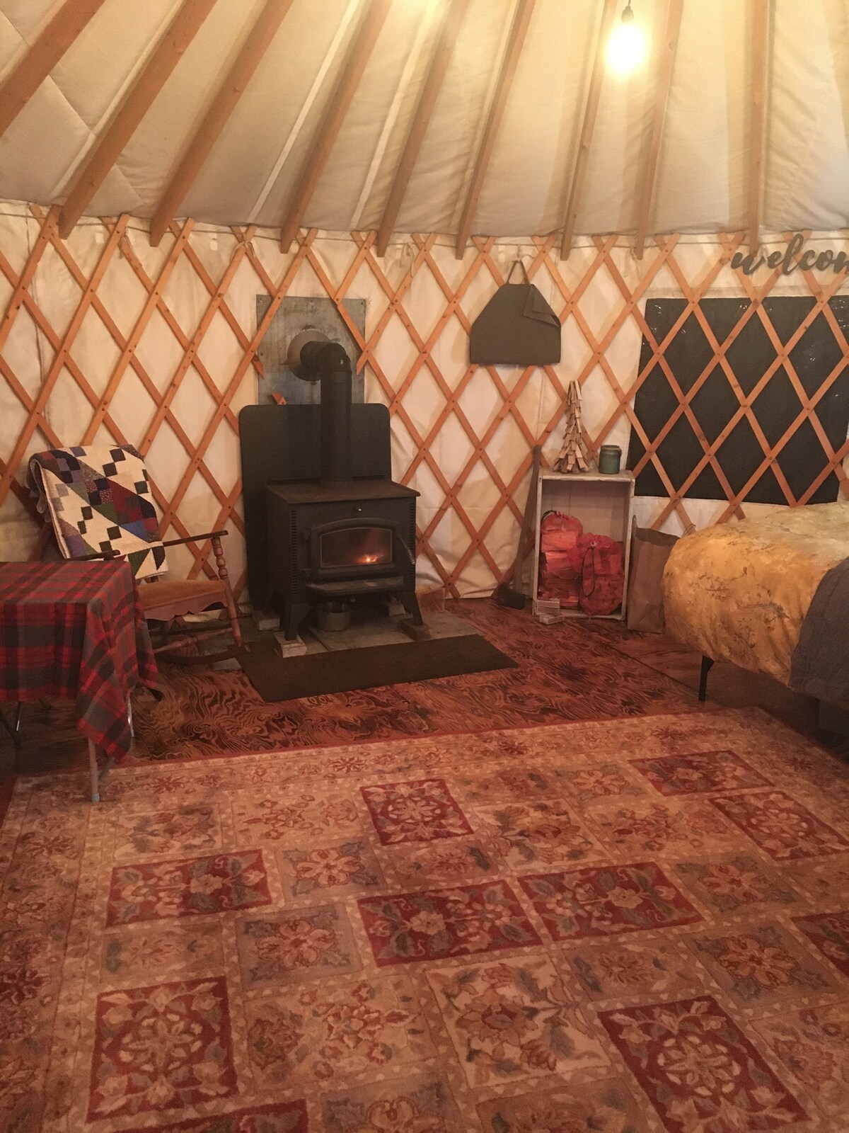 Yurt 20'ini terletak di lokasi persendirian di ladang hobi 36 ekar kami. Kami bersempadan dengan Kelly Wildlife Sanctuary seluas 800 ekar dengan denai dan kolam seluas 300 ekar. Yurt ini mempunyai kuasa, h20 berjalan sejuk, AC, tukang masak induksi, peti sejuk, mikro, mesin pembuat kopi, peralatan memasak, pinggan mangkuk, gelas, peralatan makan dan sudu garfu. Ia mengandungi katil ratu, futon saiz penuh, tilam udara, meja/kerusi, dan dapur kayu. Terdapat pancuran mandi luaran dengan h20 panas dan tandas adalah keistimewaan luar. Terdapat lubang api dengan tempat duduk.