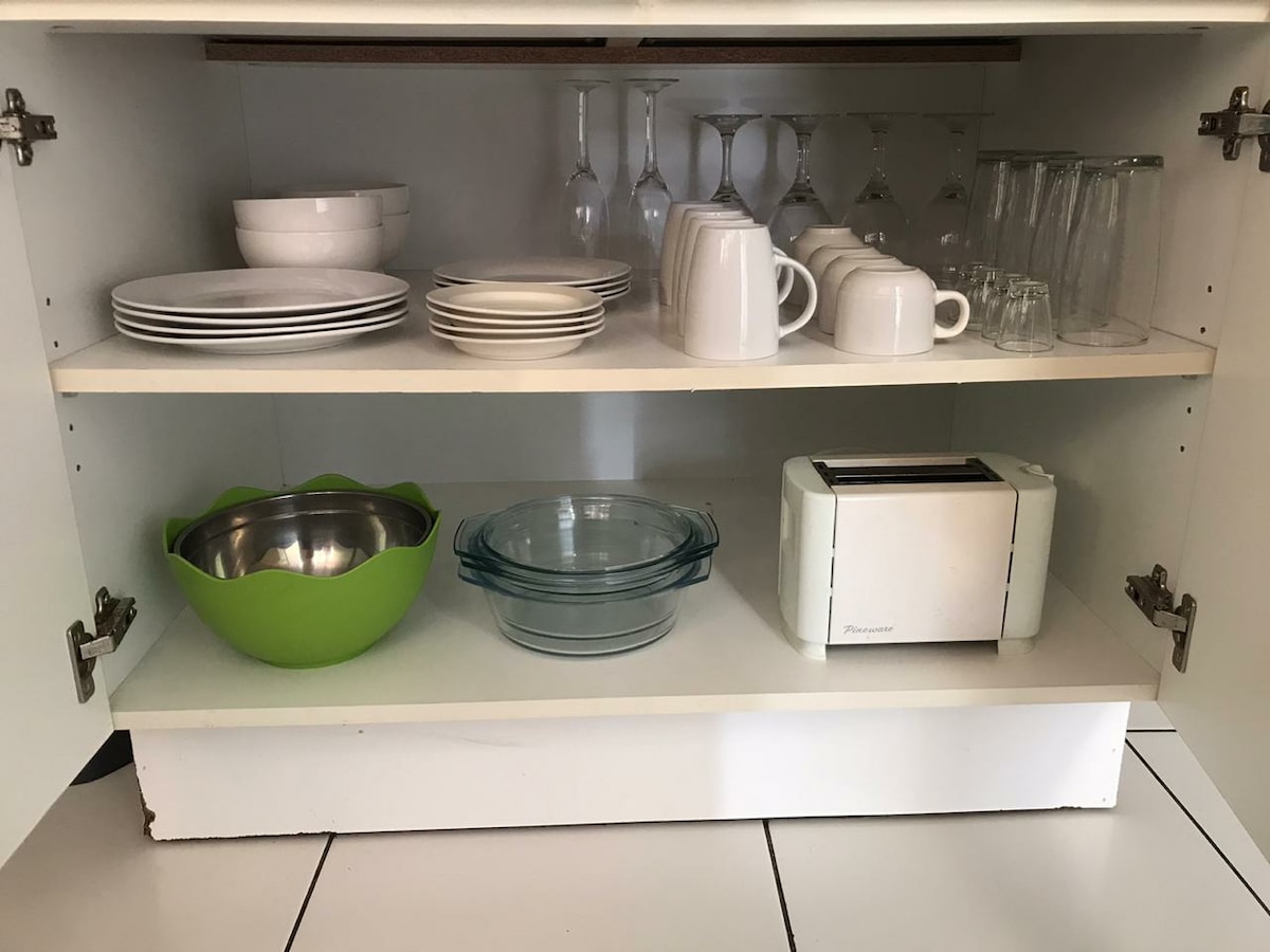 Flat yang baru diubahsuai dengan pintu masuk peribadi, tempat letak kereta percuma di bawah bumbung dan berturap. Suria baru-baru ini dipasang. Air lubang bor. Mesra kanak-kanak dan haiwan peliharaan. Kawasan braai persendirian. Dua ruang kerja. Sambungan USB dalam palam dinding. Wi-fi percuma. TV dengan Netflix. Pengering rambut dan seterika. Katil saiz queen. Dapur persendirian dengan penggorengan udara, ketuhar gelombang mikro, pembakar roti, cerek dan plunger, pinggan mangkuk dan kutleri. Bilik mandi yang sangat luas dengan tab mandi, pancuran mandi, tab mandi berkembar, bidet dan tempat duduk luar.
