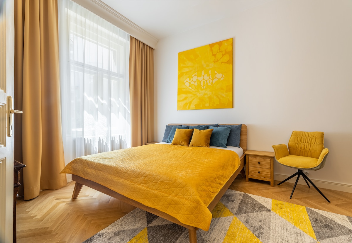Apartmen satu bilik tidur yang cerah ini terletak di pusat pusat bersejarah Prague. Apartmen ini boleh memuatkan sehingga empat orang berkat katil double yang besar dan sofa besar yang juga muat untuk dua orang. Reka bentuk apartmen ini berwarna kuning dan mewah dengan lantai kayu, tingkap besar dengan bidai, dan bilik mandi en-suite moden. Unit ini juga termasuk dapur dengan peti sejuk, cerek, peralatan makan, mesin basuh pinggan mangkuk, dan perkakas dapur lain. Anda akan tinggal betul-betul di tengah-tengah.
