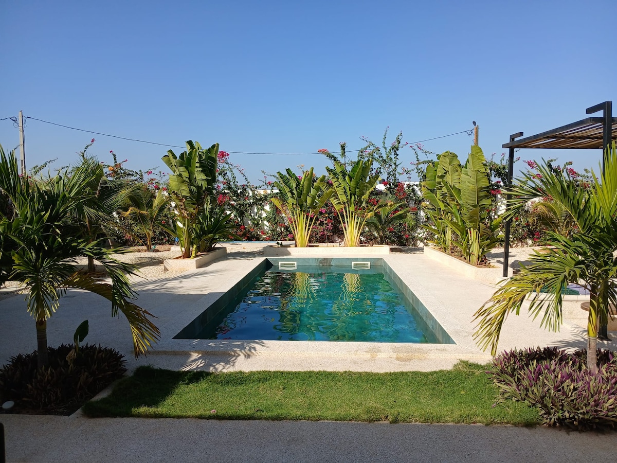 Bersantai di ruang yang tenang dan bergaya ini. Anda akan berada 5 minit berjalan kaki dari pantai terbaik di Senegal di tempat yang tenang dan terletak di pusat bandar ini. Baru diubahsuai, semua peralatan dan lekapan baharu, apartmen ini selesa dan mudah. Anda akan berada di dalam kompleks yang selamat dan dikawal dengan restoran di lokasi. Bekalan elektrik dan wifi termasuk dalam kos sewaan. Kayak, jetski dan kerusi pantai boleh disewa hanya beberapa minit jauhnya.