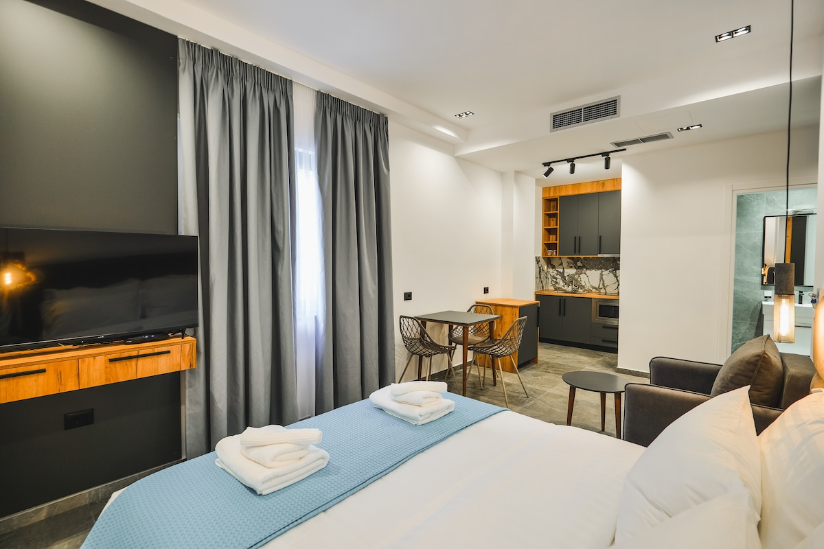 Penginapan ini mempunyai gayanya sendiri. Ia adalah penthouse eksklusif dengan pemandangan Laut Ionia yang hebat dan utara pulau Corfu. Apartmen penthouse ini dilengkapi dengan dua bilik tidur dengan langit berbintang, 2 bilik mandi masing-masing dengan pancuran mandi, pengering mesin basuh, dapur eksklusif dengan peralatan terbina dalam MIELE. Apartmen ini juga mempunyai sistem bunyi Sonos yang hebat, banyak fungsi cahaya warna LED dan pusaran air besar dengan matahari terbenam setiap hari.