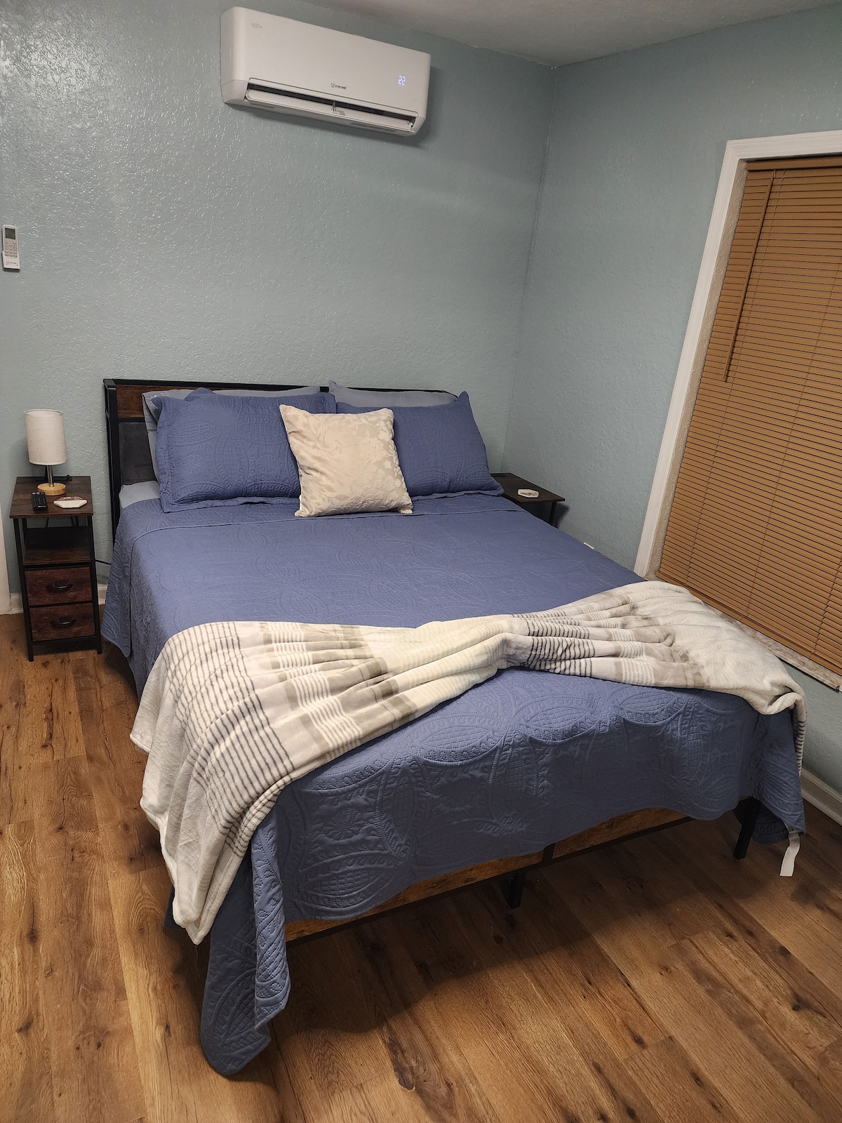 Ruang untuk 2 orang. Studio persendirian, pintu masuk persendirian, tempat letak kereta di hadapan. Dilarang merokok di studio. Pancuran mandi peribadi yang besar dengan pelembut, kepala yang boleh ditanggalkan, Katil KING, tv warna, kabel ,wifi. Meja yang cukup besar untuk digunakan untuk perniagaan, ketuhar gelombang mikro, mesin pembuat kopi, pembakar roti, peti sejuk, almari laci, peti dengan simpanan gantung dan cadar yang disediakan. Terdapat ruang duduk di luar untuk merokok dan berehat. Unit AC/Pemanas yang ditambah dipasang bersama-sama dengan unit sistem pusat standard rumah utama kami untuk keselesaan tambahan yang dikawal oleh anda