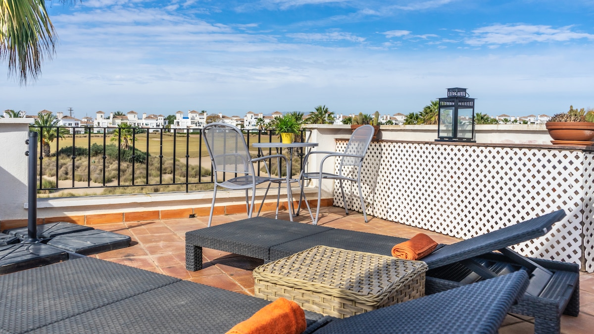 Penthouse tingkat 9, 3 bilik tidur, 2 bilik mandi Km 17.8 La Manga, Veneziola Teres 80 m2 dalam pemandangan Mediterranean dan Mar Menor, pergola teduh, solarium dengan buaian rajut dan kawasan sofa santai Pantai Mediterranean, direct access tanpa halangan Kolam renang, taman, jakuzi, sauna dan gimnasium di kompleks perumahan Wifi Fiber Berkelajuan Tinggi Dilindungi Tempat Letak Kereta TV Pintar 55" Netflix, video perdana, movistar + Pembuat kopi Pemanas Alexa 2 basikal 1 skuter elektrik 1 kayak 2 orang dewasa + 1 kanak-kanak Pek alu-aluan