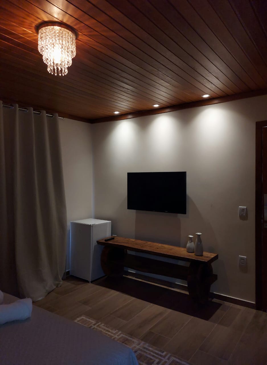 Apartamento com cama de casal, tv, frigobar, ventilador, banheiro e varanda privativa. Diária para 2 pessoas com café da manhã incluso. A pousada possui internet wi-fi, piscina, estacionamento e restaurante anexo.