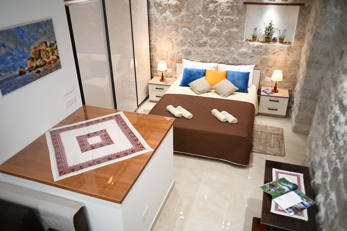 Apartmen batu moden di tingkat bawah dan dipasang sepenuhnya untuk 2 orang, terletak di tengah-tengah Bandar Lama Dubrovnik dan termasuk satu bilik tidur dengan katil kelamin, bilik mandi, ruang tamu, dapur kecil yang serba lengkap, AC, Wifi, TV, mesin basuh, seterika, linen dan tuala bersih, tingkap kalis bunyi, jarak dekat dengan perhentian bas, kedai roti, bar, restoran, dan pantai. Daftar masuk sendiri dengan kotak kunci, atau daftar masuk dengan bantuan hos atas permintaan. Layari cadangan kami tentang tempat yang boleh dikunjungi