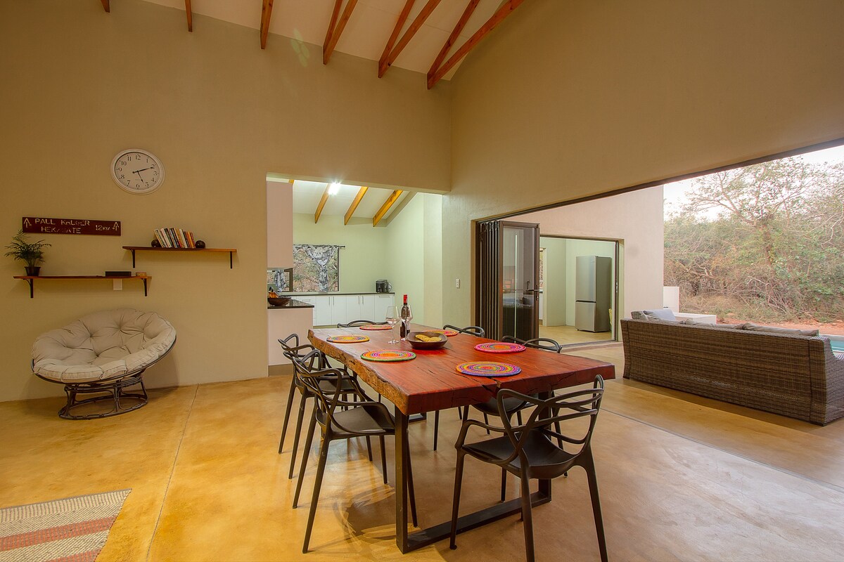Mulakan safari anda dari Serenity, vila luas yang cantik, berhampiran dengan pagar yang bersempadan dengan Kruger Park. Menghadap terus ke taman. Haiwan berkeliaran bebas dan melawat setiap hari. Dapur lengkap. Patio mempunyai kipas siling untuk hari-hari yang panas. Kipas di semua bilik, pendingin hawa di kedua-dua bilik tidur, katil bersaiz queen dan bilik mandi suite. Kolam terjun duduk, barbeku tertutup. Ruang tamu, bilik tidur patio & bilik mandi mesra kerusi roda. Nikmati belukar Afrika yang terbaik 20 minit ke taman Kruger