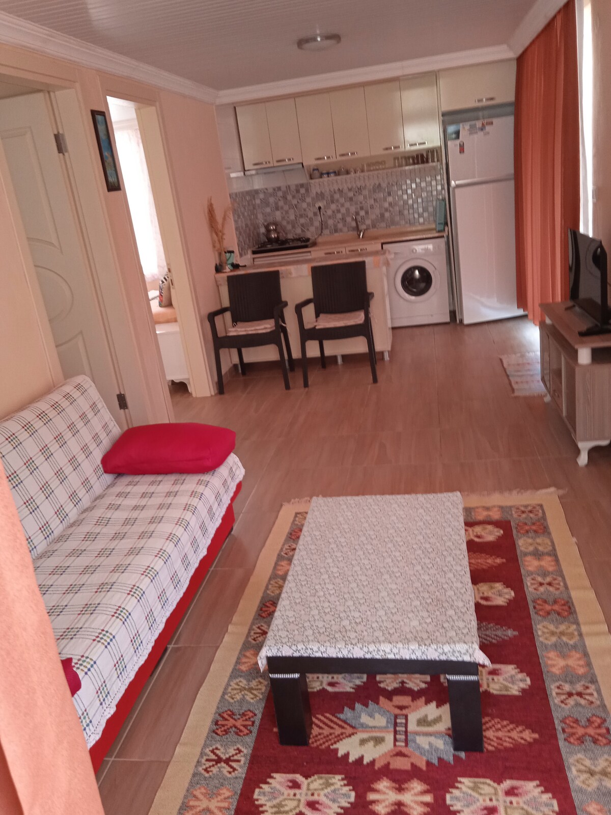 There is also a fully equipped small kitchen where you can cook in our suite apartments, which can comfortably accommodate 4 people. There is 1 double bed in the bedroom and another double bed that opens from the wall in the living room. It is quite centrally located. It is within walking distance to cafes, restaurants, beaches and shopping centers.