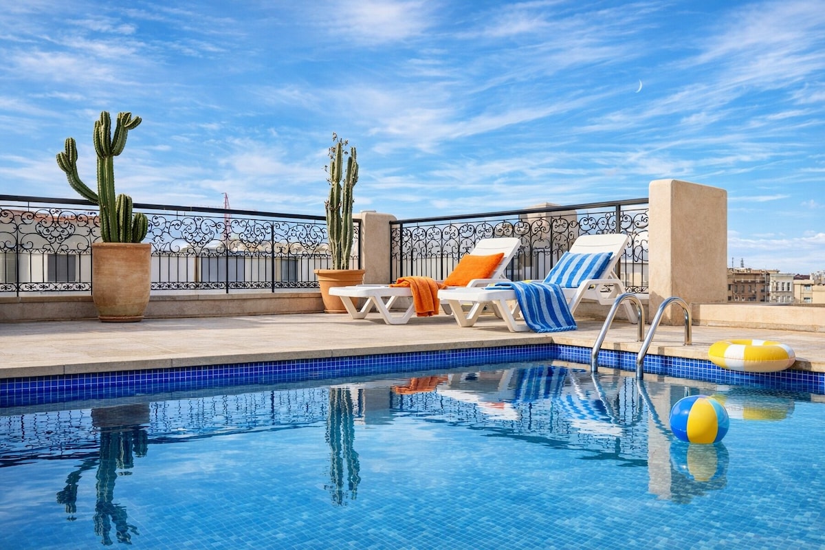Menginap di tengah-tengah Marrakech di apartmen 2 bilik tidur, 2 bilik air kami. Nikmati peralatan tempat tidur Simmons mewah, WiFi berkelajuan tinggi (gentian optik) dan hiasan moden dengan kolam renang peribadi. Dapur serba lengkap, tab mandi bergaya, dan pancuran mandi Itali. Berjalan kaki sebentar dari dataran Jemaa el-Fna, Plazza, dan Carré Eden. Kolam renang tidak dipanaskan. NB: Pasangan Maghribi yang belum berkahwin tidak dibenarkan.