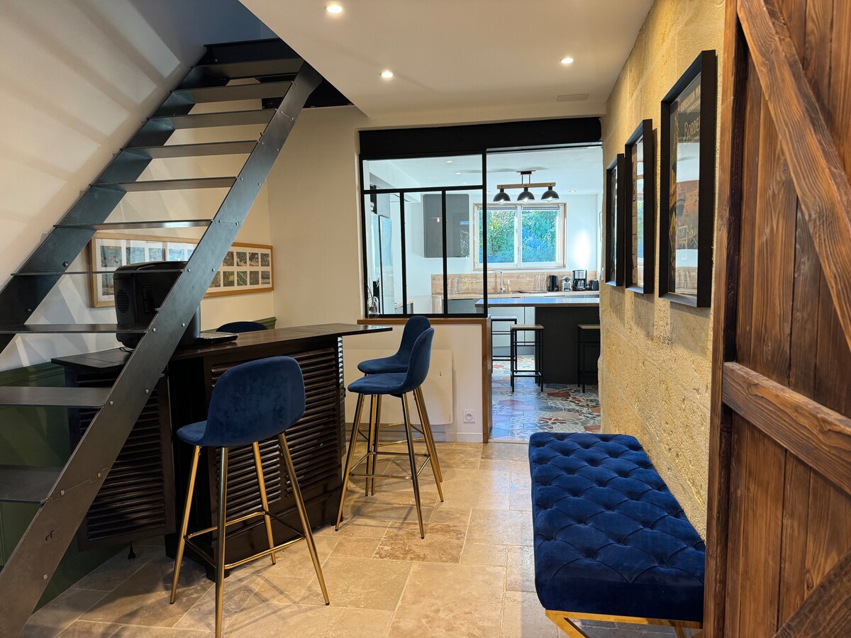 Nikmati percutian romantik di bangsal baharu seluas 75 m² ini, yang diubah suai sepenuhnya dengan penuh kemewahan. Direka untuk ketenangan dan privasi, ia mempunyai dua bilik tidur yang elegan dan boleh memuatkan sehingga 4 orang. Nikmati tab mandi air panas 2 tempat duduk peribadi, yang boleh diakses sepanjang tahun, untuk momen abadi untuk berdua. Akses dan tempat letak kenderaan persendirian. 100 m daripada pusat bandar dan 20 minit daripada Bordeaux. Haiwan peliharaan tidak dibenarkan. Pilihan atas permintaan: champagne dan sarapan pada hujung minggu.