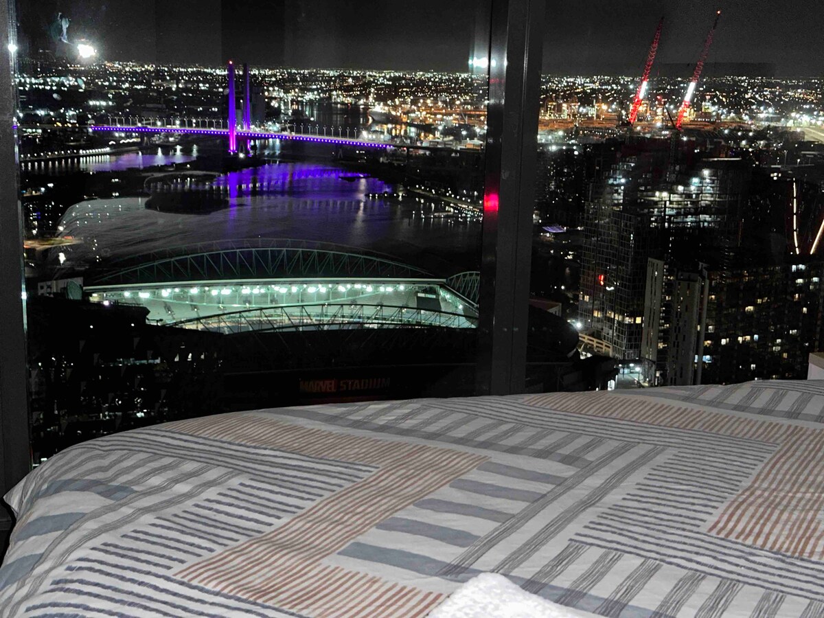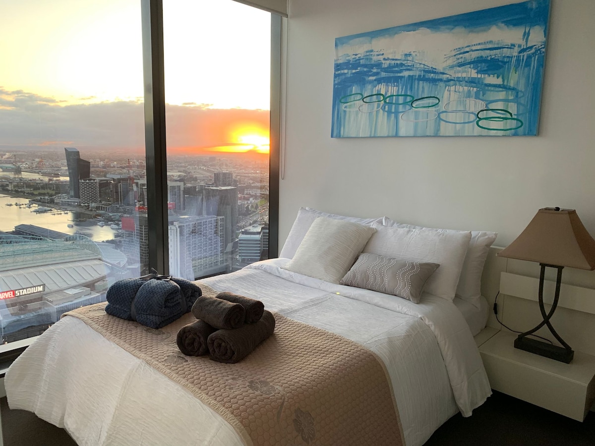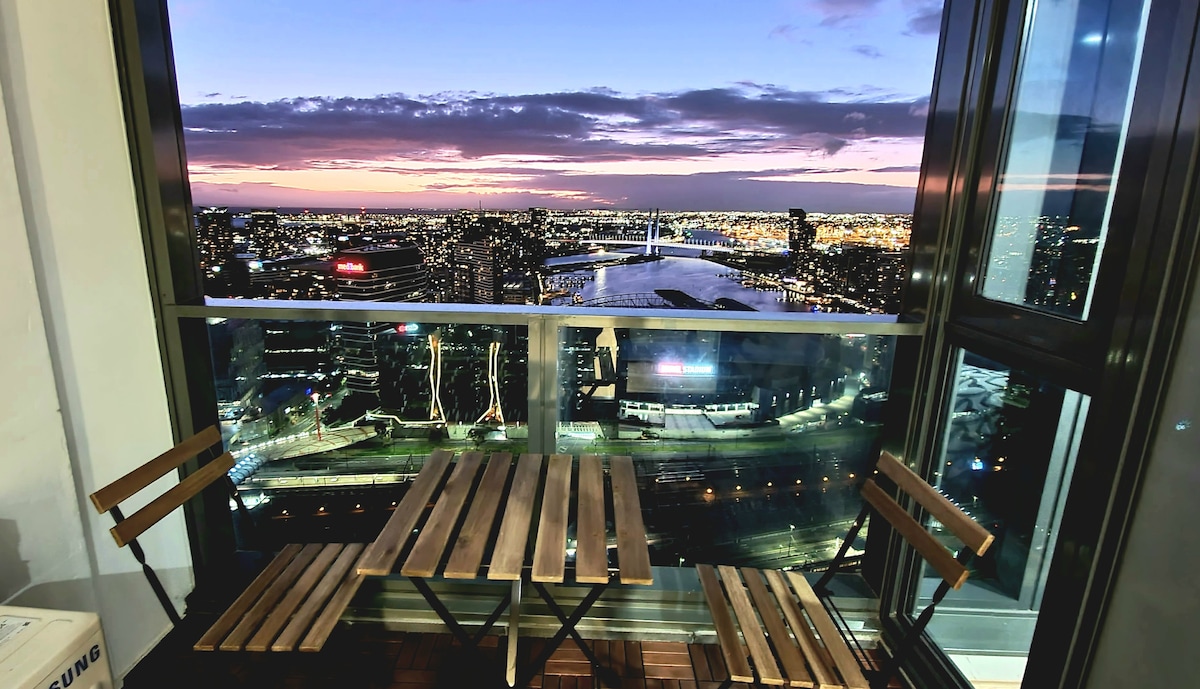 Nikmati pengalaman yang bersih dan santai di tempat yang terletak di tengah-tengah bandar ini. Cuba tingkat atas! Di Melbourne CBD tempat ini benar-benar menonjol. Matahari terbenam yang luar biasa! Pemandangan teluk, sungai, Docklands, WestGate & Bolte Bridges, bukit jauh, lampu bandar yang tidak terhalang. Mudah. Berjalan kaki ke Crown, ConventionC, Stadium Marvel, Stesen Southern Cross, il Mercato Centrale. Kemudahan yang hebat: Kolam renang/spa/sauna/gimnasium. 1x Katil queen berkualiti + 2x katil sofa berkualiti, linen, Pancuran mandi air panas, Dapur, Meja Ergonomik, AppleTV