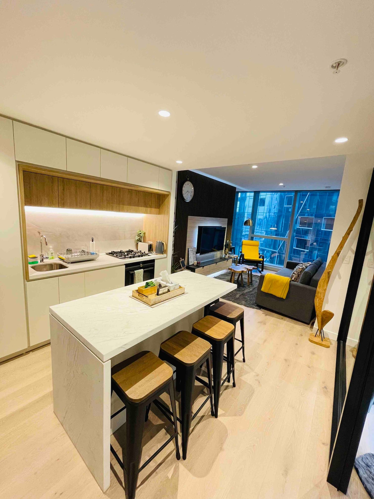 Masuk ke dalam untuk disambut oleh ruang tamu pelan terbuka yang dihiasi dengan perabot kayu bergaya dan aksen industri. Siling tinggi dan tingkap besar membanjiri ruang dengan cahaya semula jadi, mewujudkan suasana yang hangat & menarik. Bersiar-siar di luar ke balkoni besar kami dengan ruang yang luas untuk keluarga bergaul. Pusat membeli-belah District hanya sepelemparan batu jauhnya, menawarkan pasar raya, restoran, runcit dan hiburan. Perkhidmatan trem yang kerap di tingkat bawah menghubungkan anda ke CBD lain yang meriah.