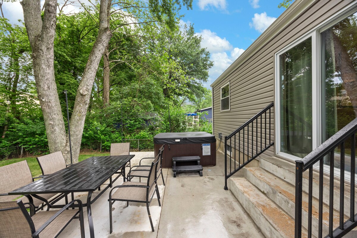 Rumah yang luas dan lengkap dengan tab mandi air panas, lubang api dengan kit s'more, bilik permainan di tingkat bawah dan halaman belakang besar yang berpagar. Sama ada anda berada di sini bersama keluarga, rakan-rakan atau untuk majlis perkahwinan di Stone House di seberang jalan, rumah ini disediakan supaya anda boleh menetap dan benar-benar berehat. Tiga bilik tidur dengan dua katil king dan katil dua tingkat, dapur yang sedia untuk memasak sebenar, dan kejiranan St. Charles yang tenang yang berhampiran dengan restoran, kilang wain dan taman.