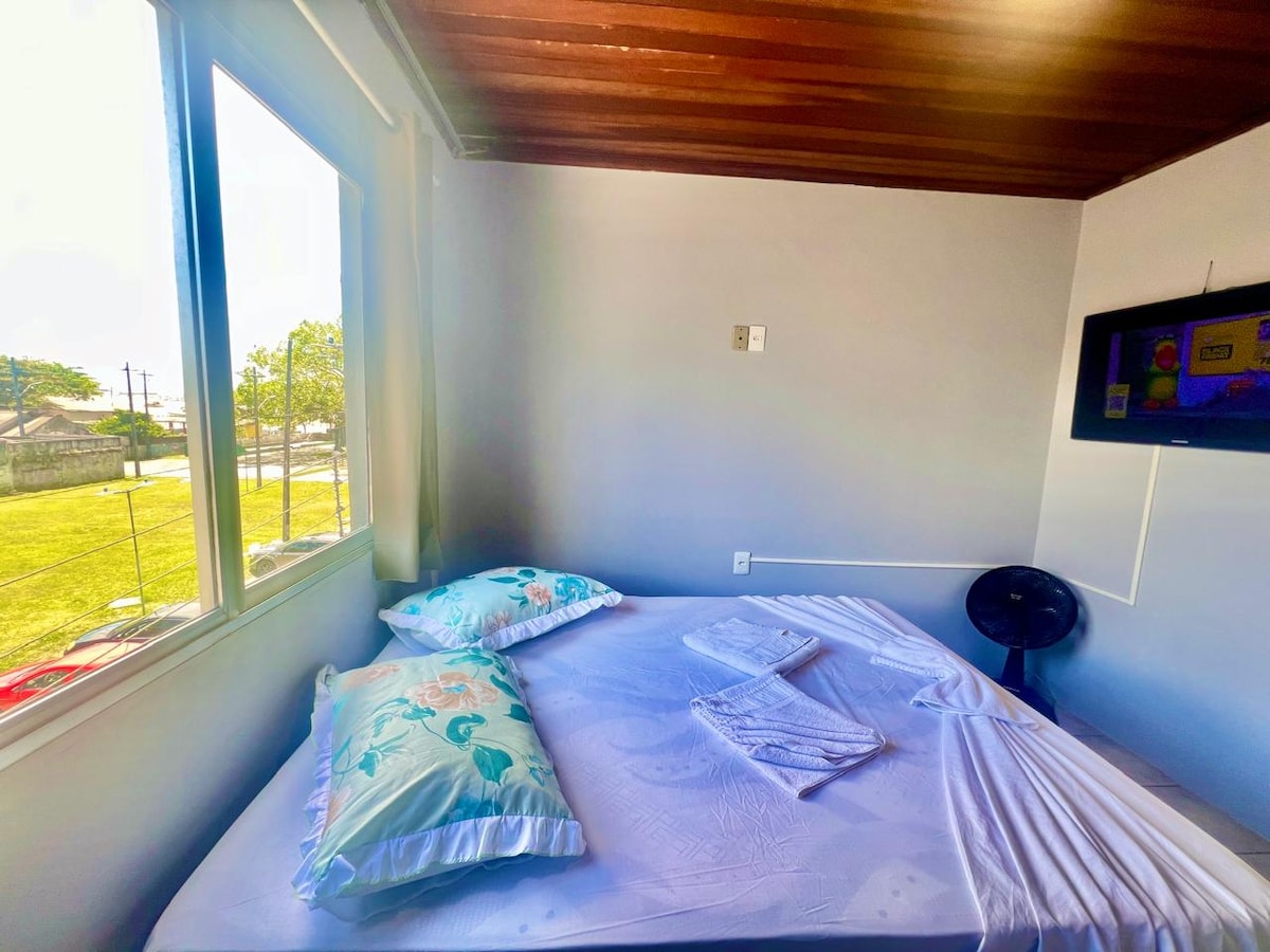 🏖️ Studio dengan barbeku menghadap laut. terletak di Balneário Caravelas🌊 ✅Sesuai untuk 2 orang, dengan kemungkinan menerima sehingga 3 tetamu (pasangan dengan 1 kanak-kanak atau bayi) 1 katil kelamin dengan katil tambahan tilam single Peralatan asas dapur Barbeku dengan gril dan kipas ekzos Pakaian mesin basuh Kerusi pantai, teduhan matahari ☀️ Penyaman udara Kipas siling TV & WiFi Ruang 🚗garaj 🚨KAMI TIDAK MENAWARKAN KAIN KATIL, KAIN MEJA, TUALA ATAU SELIMUT.