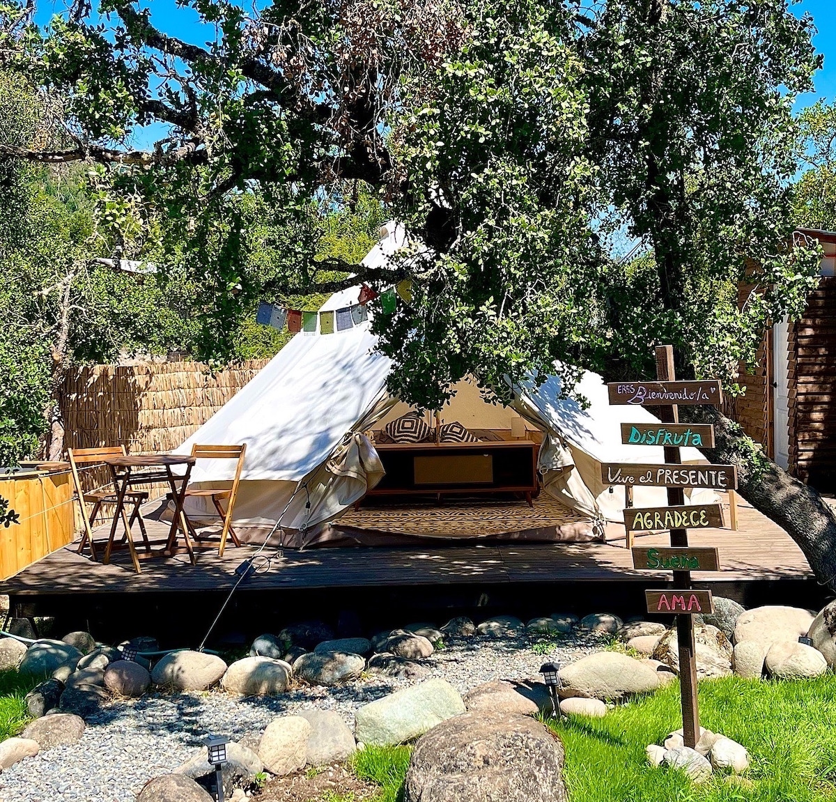 Acampa en la naturaleza con más comodidad en el tipi con cama de 2 plazas y cama de 1 plaza. Ya está listo para recibirte y dormir bajo los cielos estrellados de la cordillera. El valor incluye una noche en el tipi para hasta 3 personas, ropa de cama, mesa, linterna, acceso al baño y duchas, lavaderos, cancha de volleyball, mesa de ping-pong, estacionamiento, acceso al río, pizzeria, wifi. Parque Tricahue a 1km solamente. Posibilidad de pedir desayuno por un valor adicional de $6.000 × persona.