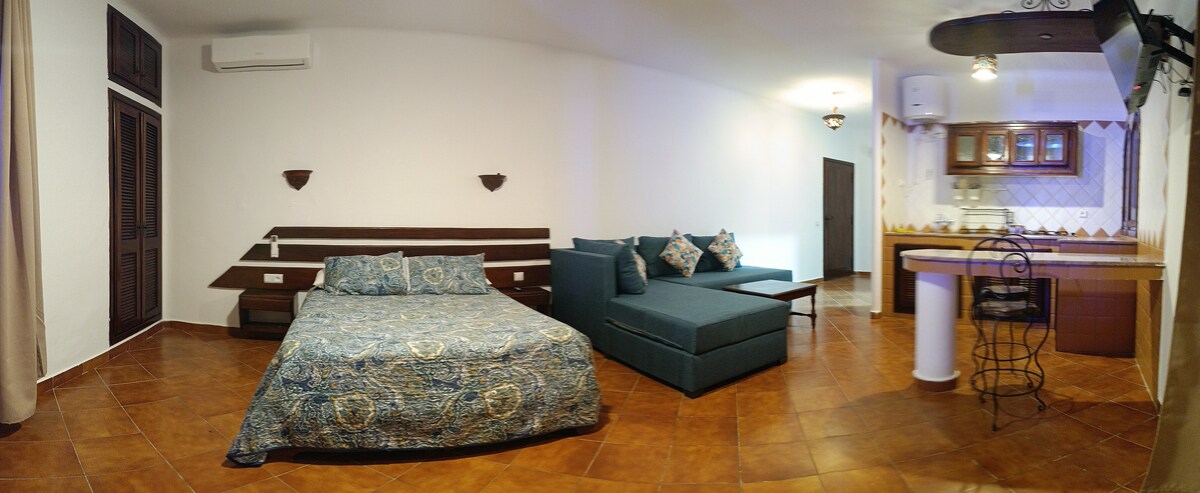 Estudio impaca ; es un estudio reformado recientemente ; apto para un maximo de cuatro personas. Esta en el mismo centro de Tetuan; cerca de la mezquita hassan ll ; a 5 minutos andando de la plaza moulay mehdi. Cuenta con una cama matrimonio ;2 sofas -cama ; ideal para pareja con niños ; grupo de amigos.. aire acondicionado. Cocina con utensilios;platos;lavadora. Ducha con agua caliente Esta en el mismo edificio que apartamento impaca, ideal para grupos que quieran quedar unos cerca de otros.