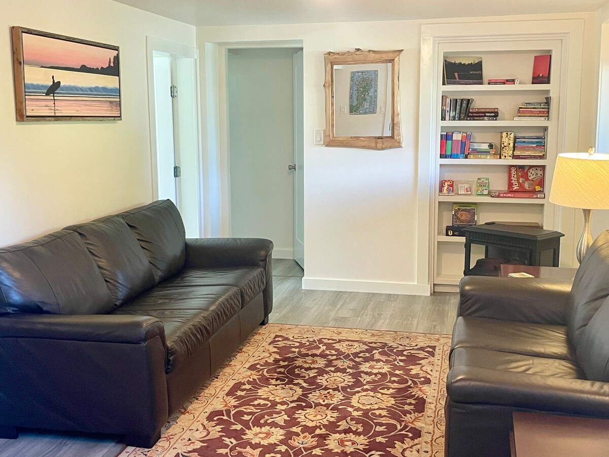 Suite satu bilik tidur kami yang besar dan selesa terletak di tengah-tengah jalan buntu yang tenang di pusat bandar Tofino. Dapur bersaiz penuh yang serba lengkap, katil bersaiz queen yang selesa, WiFi, TV, meja besar, banyak sentuhan funky dan menyeronokkan. Dua minit berjalan kaki ke pusat bandar dan berhampiran dengan laluan mendaki, taman luncur, taman permainan, Pantai Tonquin, dan laluan pelbagai guna. Atau hanya berehat di taman kami! Sesuai untuk pasangan. Lokasi yang hebat membolehkan anda bebas kereta untuk lawatan anda. Lesen Perniagaan 20240340