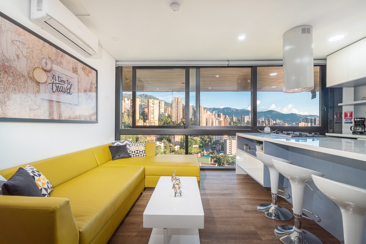 BARU DIUBAHSUAI - Internet berkelajuan tinggi sesuai untuk kerja jarak jauh - A/C baharu - Apartmen reka bentuk perindustrian yang diubahsuai sepenuhnya - Katil saiz raja - Pemandangan Medellín yang menakjubkan (percayalah, berbaloi menginap di sini) Tingkat 19 - Lokasi menarik di Poblado berhampiran dengan Provenza dan Lleras Park - Kemudahan moden -Tempat tamu luas - Smart TV x 2 - Dapur yang serba lengkap - Menara Mesin Basuh & Alat Pengering - Kolam renang -Gym - Ruang kerja -Restoran di dalam bangunan - Tempat letak kenderaan persendirian - Daftar masuk sendiri -24/7 Keselamatan