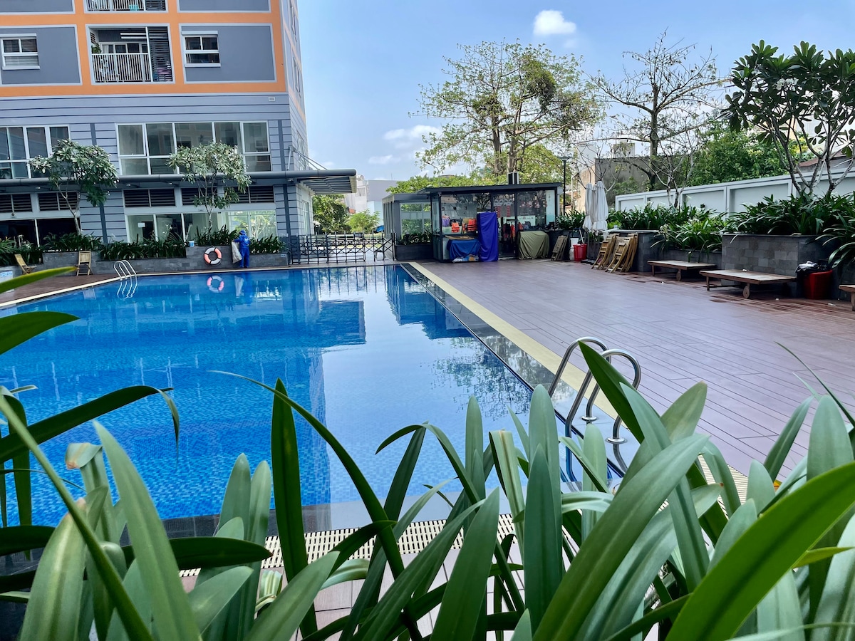 Manjakan diri anda dalam kemewahan sambil meneroka SG yang menakjubkan!Seluruh apartmen 1 bilik tidur ini akan menjadi tempat percutian anda daripada HCM City yang sentiasa meriah. Apartmen saya terletak jauh di atas kesibukan bandar. Anda boleh berehat di tepi kolam renang infiniti atas bumbung atau bersenam di gimnasium yang lengkap. Kedua-duanya percuma! Langkah keluar, dan anda akan berada di tengah-tengah segalanya: restoran, kedai kopi, makanan jalanan, pasar dan kehidupan malam. Tarikan pelancong Daerah 1 hanya 3 minit, memandu atau berjalan kaki singkat merentasi sungai SG