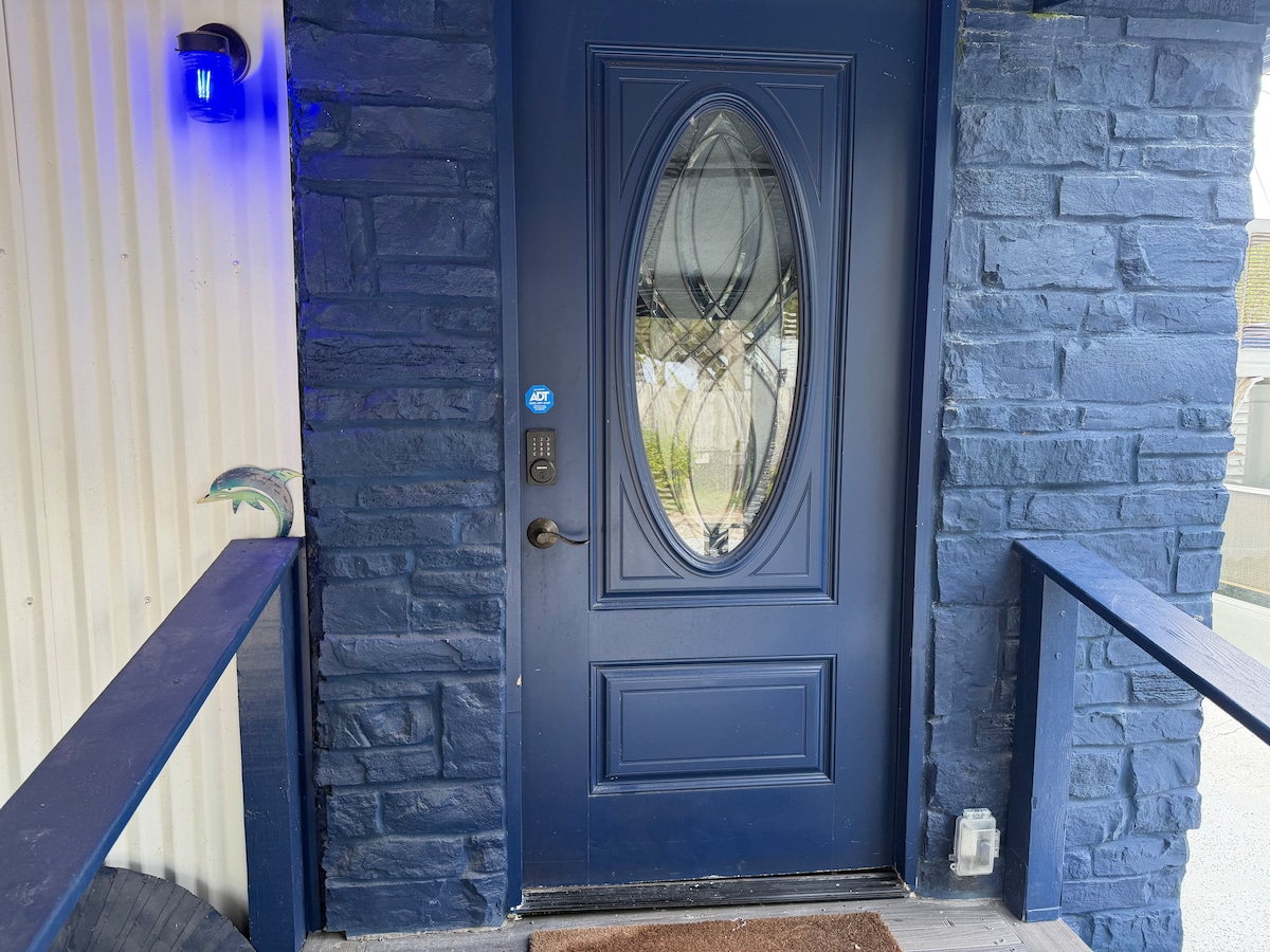 Rental space is private, downstairs only. Owner lives on-site in a separate upstairs unit. The house is configured as a duplex. The entire home is newly remodeled. Vintage mid-century modern, laid back cumfy beach style home. One short block walk to the beach, located riverfront with a pool in the backyard. Pool is gas heated upon request for a nominal charge. Private dock. 3 bedrooms, 2 bath. 2 w queen bed, 1 with 2 twins. There is a fourth bed in the den upon request please