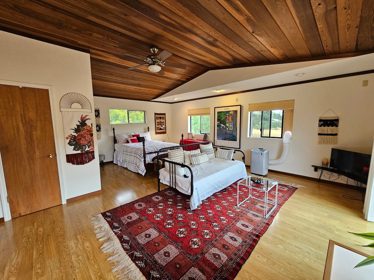 A guest suite downstairs-totally separate from upstairs w/a nice garden outside. You walk down a gravel & brick path to enter @ ground level. It is a large studio w/old growth beams & full length windows, kitchen area, bathroom w/ a jacuzzi tub. There is a Paul Bunyan California King size bed w/ steps, w/no railings. Much room to roam. The outside yard is shared space, yet, we don’t walk in front of your windows and will respect your privacy. There’s a garden & fruit trees to graze in season.