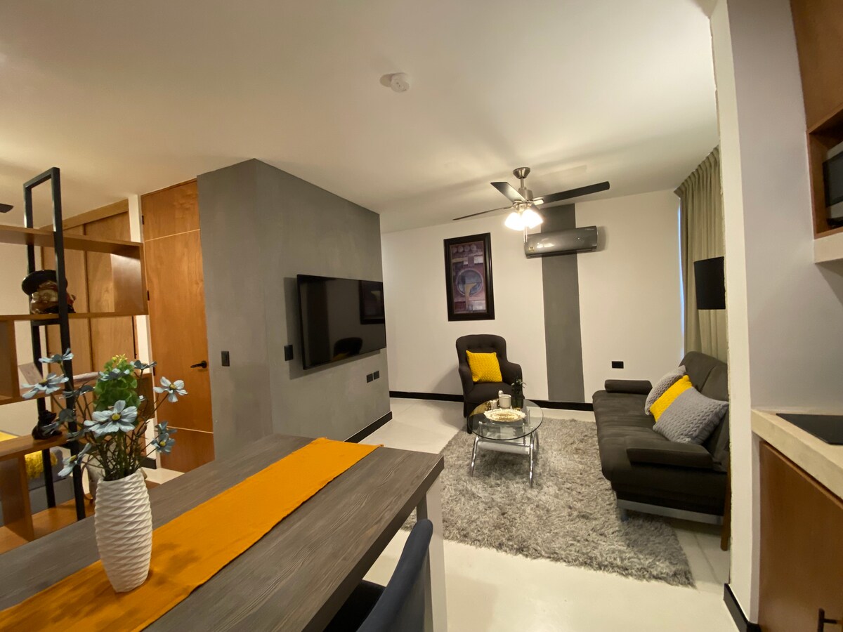 Depto tipo Estudio, moderno, cómodo y bien equipado, ubicado en excelente zona al NORTE de Merida (no CENTRO), acceso rápido a Centros comerciales, Restaurantes, Bancos, Museos y Puerto Progreso (playa). Ideal para trabajo, vacaciones o fin de semana. Centro Comercial Galerias y Gran Plaza a 5min en vehículo, La Isla Merida y Plaza Altabrisa a 15min. Caminando queda: Centro de Convenciones 18min Escuela Bancaria y Comercial (EBC) 12min Plaza comercial Altana 12min Chedraui Selecto 15min