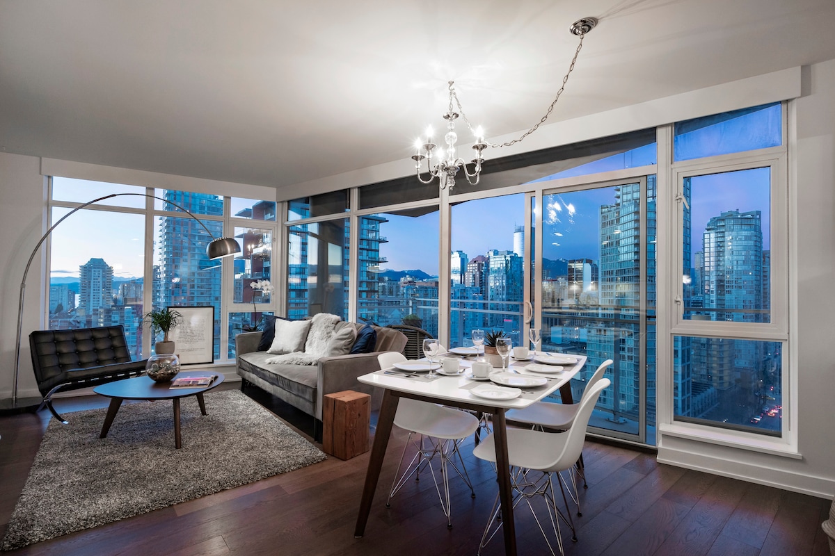 Amazing location, Canadian art, design and a great view. Treat yourself to a 5-star stay - perched high in the sky - right in the middle of downtown Vancouver. Walk everywhere, from mouth-watering restaurants, to shopping and even the seawall a short walk away. Super easy to get to from the airport - just a quick 10-minute walk from the skytrain. This is the perfect place to relax and unwind before exploring the town. This is a chill space though - please, no parties or events.