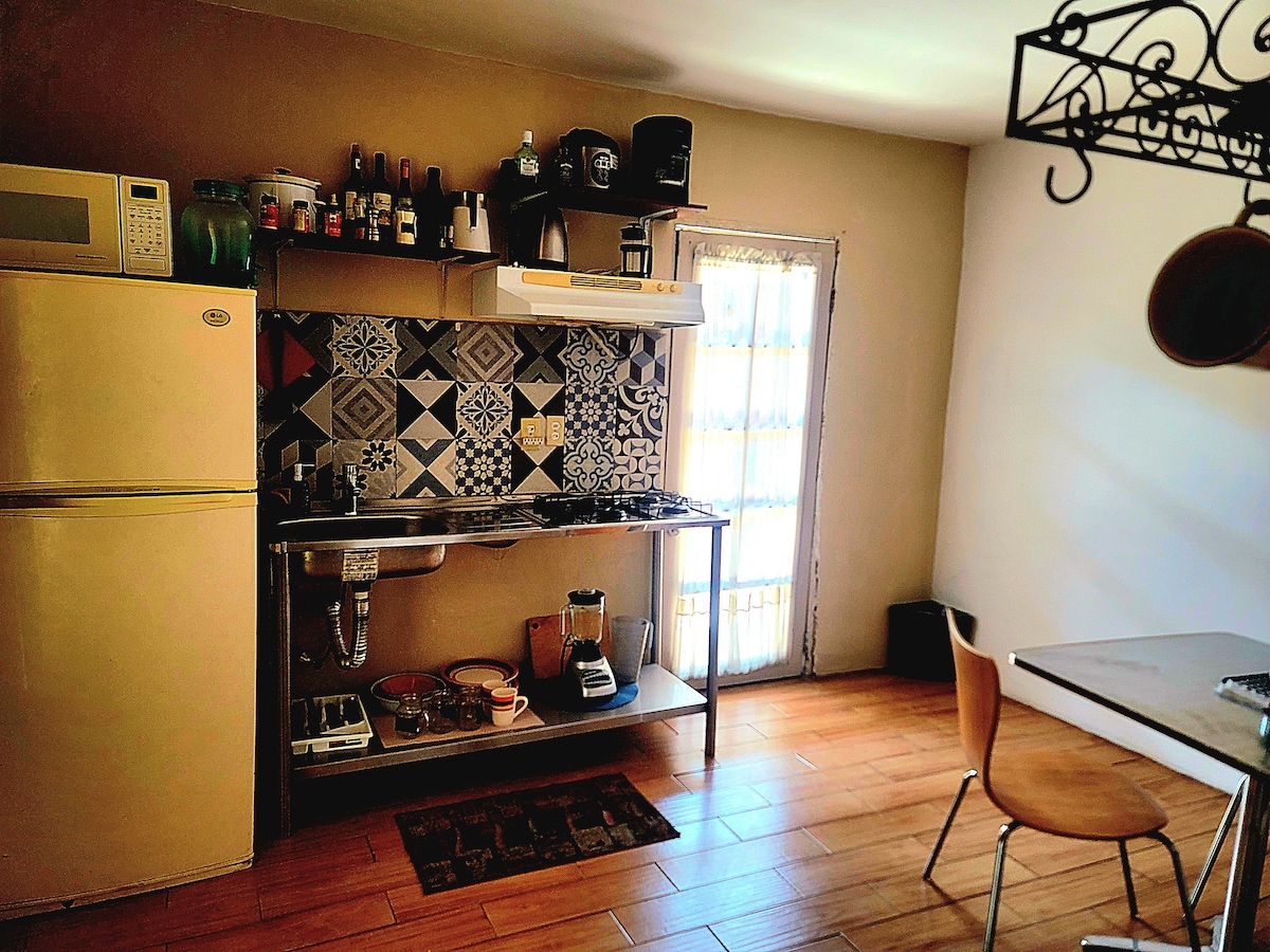 Este lugar tiene una ubicación estratégica: ¡será muy fácil planear tu visita! Estamos entre las 2 garitas a Estados Unidos, cerca de nido de los águilas, área de hospitales, gimnasio de mexicali, somos tu mejor opción en ubicación. Nos encontramos en un segundo piso, abajo encontrarás un spa y una escuela de danza. Contamos con estacionamiento techado exclusivo para huéspedes. En la cocina tenemos parrilla eléctrica con doble quemador, cafetera, microondas, refrigerador y utensilios AC y WiFi