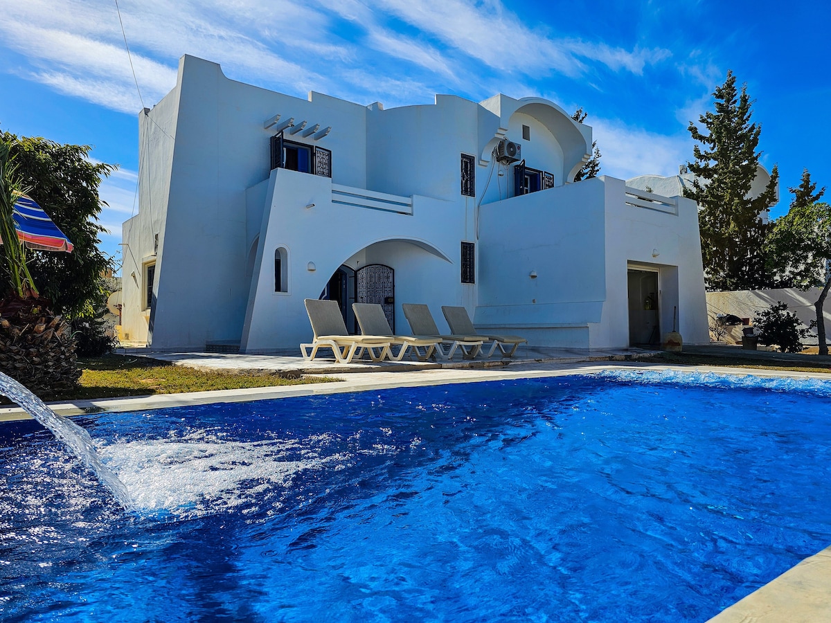 🏝️selamat datang ke vila Lamys Djerba 🏝️ vila yang cantik dengan kolam renang persendirian tidak terabai sangat baik terletak di kawasan yang tenang 400 meter dari laut, jalan raya dan jalan yang membawa ke kawasan pelancongan hanya 10 minit dari pantai, 5 minit dari pusat bandar Houmet souk di mana ia menemui, souk, bank, pejabat pertukaran, restoran, marina, kafe dan mercu tanda pulau. 15 minit dari lapangan terbang, berhampiran dengan semua kemudahan, tempat untuk berehat dan tarikan.