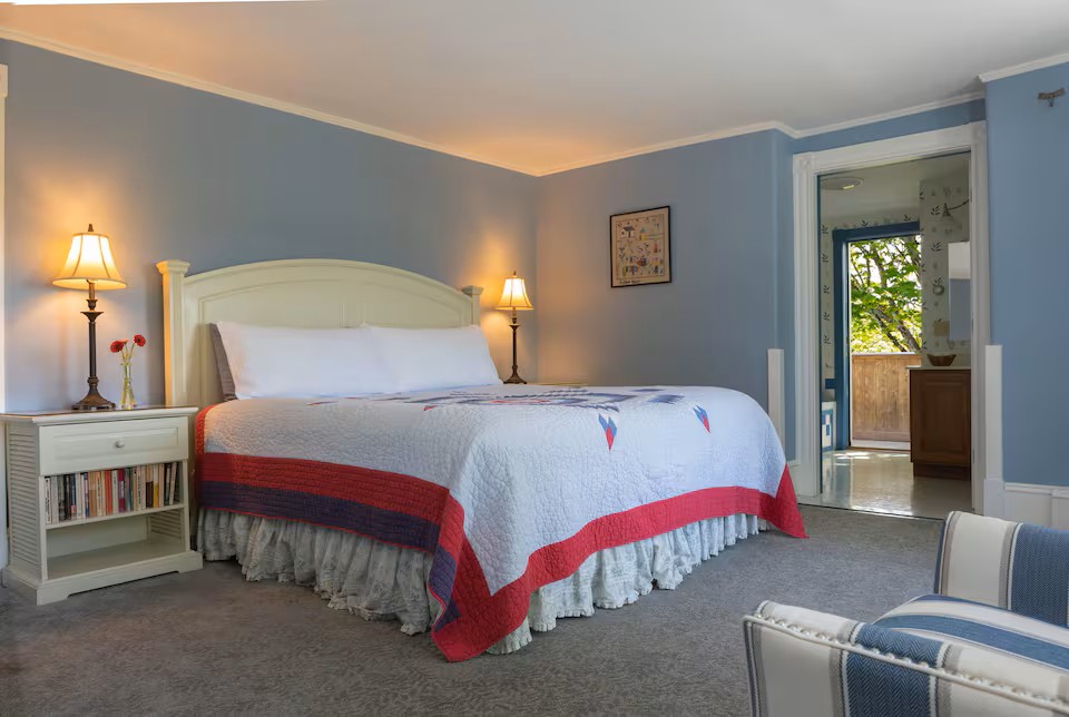 Admiral's Quarters Room 14 ialah suite penthouse 2 bilik premium dengan pemandangan pelabuhan, rumah api dan laut yang menakjubkan. Bilik tidur king menampilkan dinding tingkap, balkoni persendirian dan pendiangan. Bilik kedua menawarkan katil twin trundle dan storan terbina dalam dengan peti sejuk mini. Nikmati pancuran mandi kaca walk-in dan dua pintu masuk—satu persendirian. Sesuai untuk pasangan atau kumpulan kecil yang mencari tempat percutian yang indah dan tenang di Boothbay Harbor.