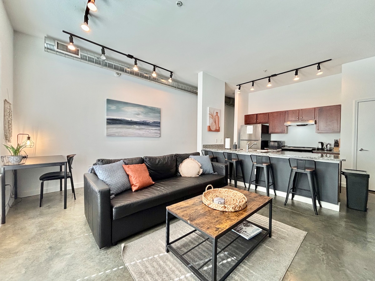 Step into urban elegance at this stunning loft-style apartment nestled in the heart of downtown Memphis, Tennessee. Located on South Front street this 1 bedroom, 1 bathroom apartment seamlessly blends a modern design with classical charm, a king bed, high ceilings,& large windows that flood the interior with natural light. Less then 4 minutes walk to the city's renowned attractions, including Beale Street's live music scene & a plethora of dining and entertainment options just steps away.