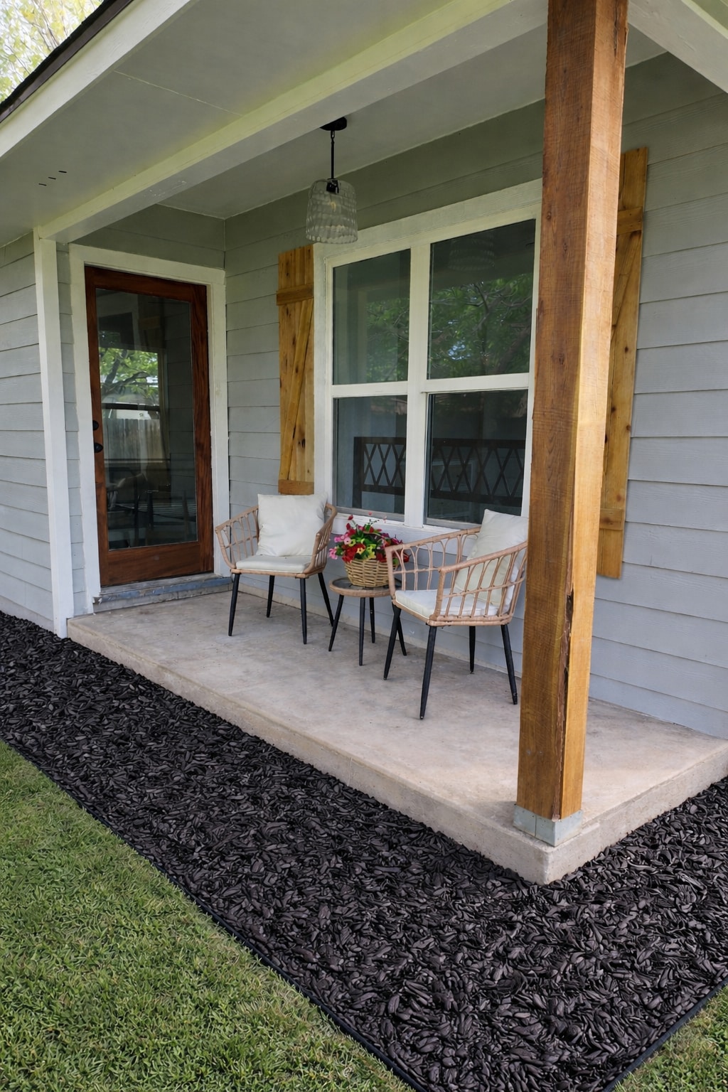 This 500-square-foot guesthouse features a king-size bed, a leather couch, and two accent chairs, providing a comfortable space to relax while enjoying the smart TV or simply admiring the view through the large window. The private suite also includes a kitchenette, equipped with a mini fridge, microwave, and a three-stool bar top for added convenience.