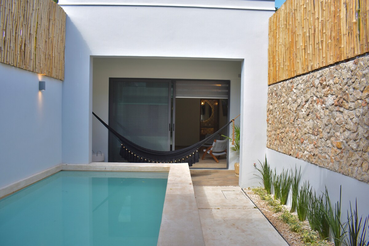 Rumah dipulihkan untuk menghasilkan ruang rehat yang intim dan canggih, tempat yang akan menambah tenaga anda. Sesuai untuk pasangan dan penginapan jangka panjang. Dalam lokasi yang sangat baik, bersebelahan dengan La Plancha Park, tiga blok dari Paseo Montejo dan satu blok dari koridor makanan 47th Street, Ia mempunyai lobi, dapur / ruang makan, teres dengan kolam renang dan ruang makan, bilik dengan katil saiz king, kawasan kerja dengan internet gentian optik, bilik mandi penuh dan pancuran mandi luar dan 2 basikal