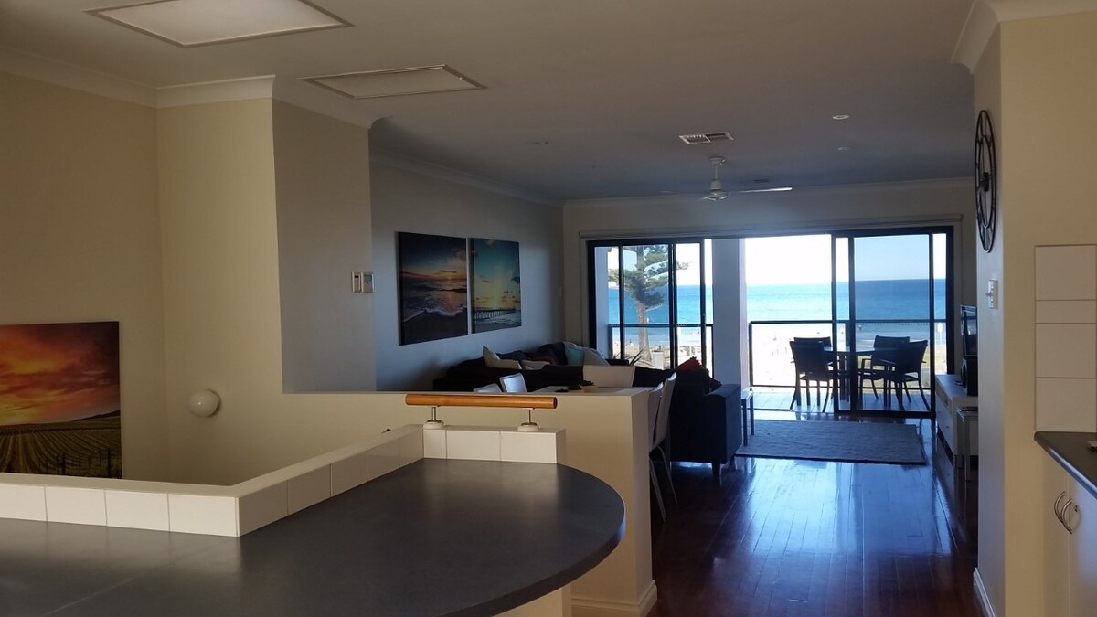 Fully self-contained two storey beach front apartment. Perfect position on the Esplanade with magnificent views. Direct access to patrolled beach. One minute walk to café and surf club. Twelve minute drive to McLaren Vale. Upstairs living - kitchen/dining/lounge with balcony overlooking the beach. Downstairs – Two bedrooms, bathroom, separate toilet, laundry area. Secure premises. Undercover parking for 2 cars. Smart 65 inch TV with Netflix. Reverse Cycle Air-conditioning.
