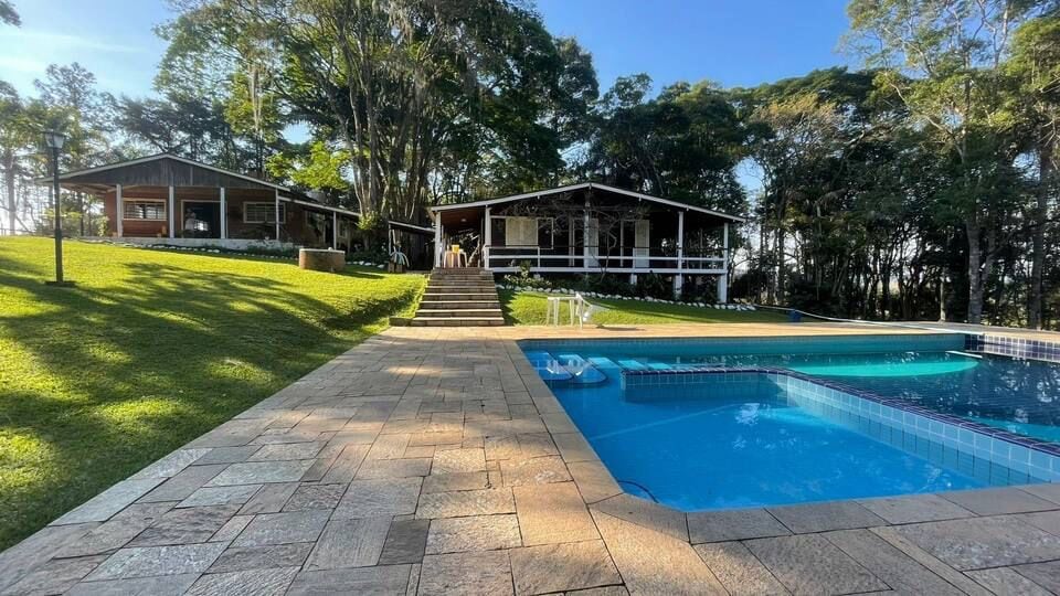 Sesuai untuk bersantai dengan keluarga, rakan-rakan 🏡 Kapasiti untuk sehingga 15 tetamu 🛁 3 bilik mandi dan 1 bilik mandi 🚗 6 tempat letak kereta Kolam renang🏊♀️ besar (5x13m dan 1.60 m dalam) 🧖♀️Sauna kering 📶 Wi-Fi dan Netflix Dapur lengkap, dengan 2 penapis air. 🥩BBQ Cadar (kualiti premium) Pengudaraan di bilik tidur dan ruang tamu Tasik Memancing 🐟Sukan Taman dengan pokok buah-buahan (pitanga, acerola, dsb.) Persekitaran yang ideal untuk berehat dan berhubung dengan alam semula jadi.