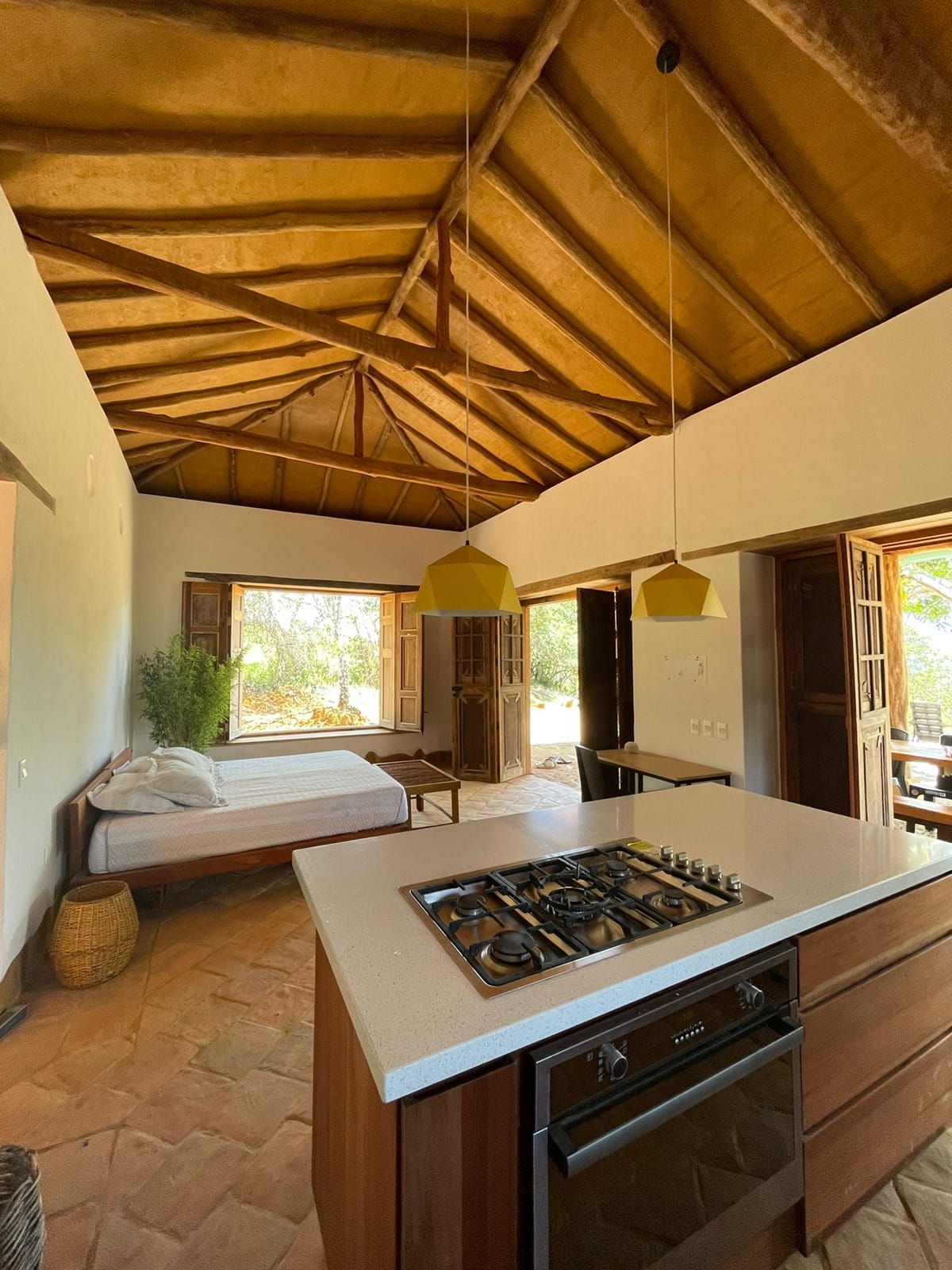 Hermosa casa de bahareque ubicada a 5 km del pueblo, de media hectárea y arboles frutales para el consumo. Cuenta con dos casas, en una encontraras el cuarto principal con su hamaca y en la otra la cocina. El baño es al aire libre lo que hace la experiencia única. Vista hacia el pueblo, dotado sin TV, especial para compartir en tranquilidad y desconectar. Importante: Solo hay una cama, y otra inflable sencilla. Apto para llegar en mototaxi, 4x4 o un carro alto fuerte, debido a que es campo.