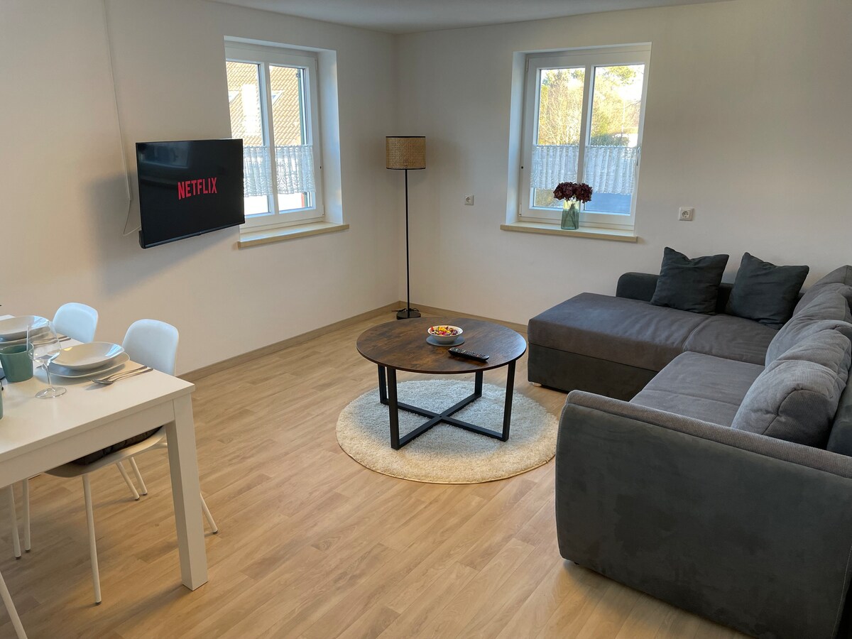 Apartment baru kami terletak di tingkat bawah. Ia lengkap dengan keluasan 54 m². Terdapat di dalam apartmen satu bilik tidur, bilik mandi tempat makan yang bagus,- ruang tamu dengan katil sofa tarik keluar. Teres yang luas dengan ruang rehat dan tempat duduk juga boleh digunakan termasuk taman besar dengan bingkai pendakian untuk kanak-kanak. Terdapat banyak tarikan di kawasan kami, contohnya Legoland, Muzium Steiff. Apartmen ini tidak sesuai sebagai mekanik,- apartmen pekerja.