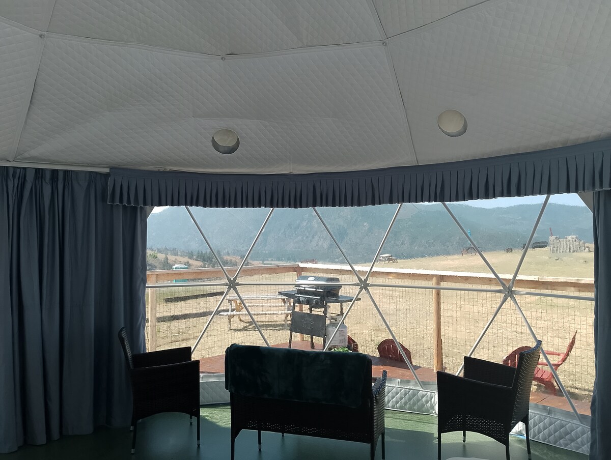 Kubah Geodesik ini terletak di tepi anak sungai yang dipenuhi ikan trout. Sungai sepanjang tahun mengalir di 3 sisi kubah sering meminjamkan bunyi air. Terdapat akses ke pulau persendirian dengan dek berdiameter 33’dengan meja untuk 12+ dan barbeku. Khemah kubah ditebat dengan lantai terlindung, pemanas & penyaman udara. Kubah ini mempunyai tandas & singki bilik mandi RV, katil queen di tingkat utama & katil queen di tingkat 2. Penginapan ini adalah syurga nelayan yang sangat dekat dengan laluan basikal di sepanjang 93.