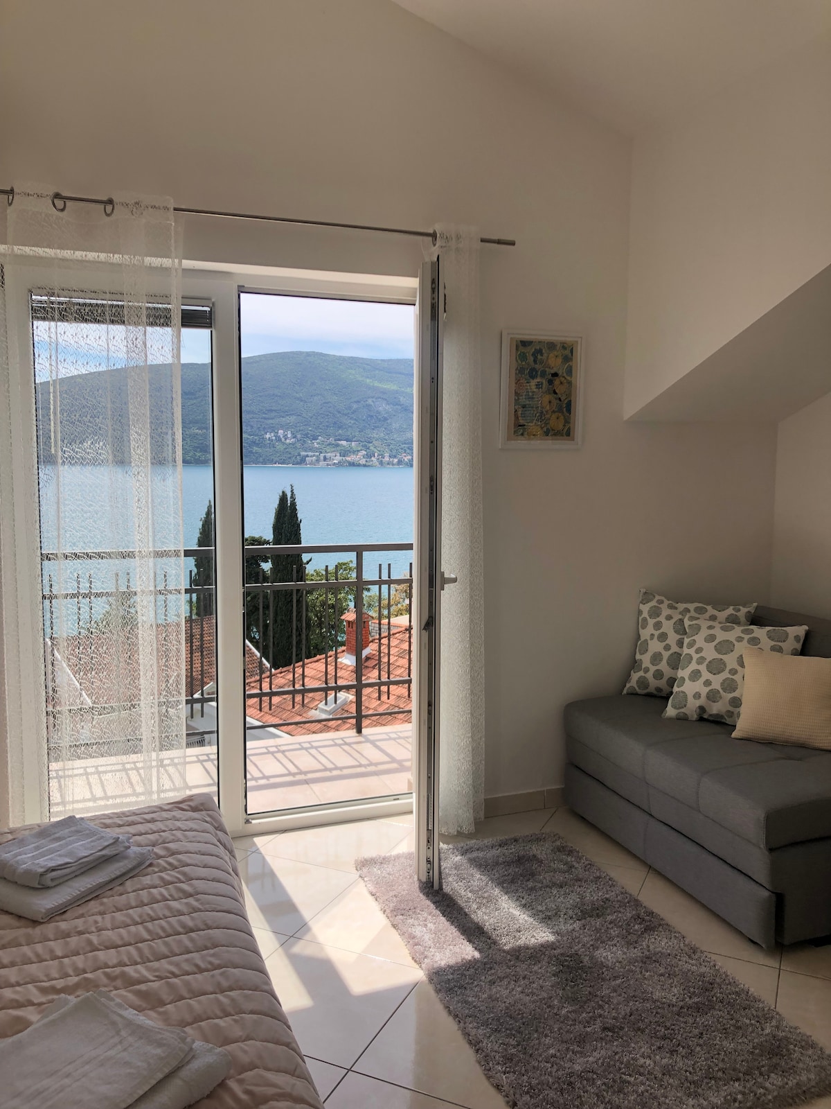 Studio/apartmen terletak di tingkat satu rumah dan mempunyai dapur, bilik mandi dan balkoni peribadinya sendiri. Dari balkoni, anda boleh menikmati pemandangan indah Boka Bay dan Selat Verige. Tetamu juga mempunyai akses kepada teres di hadapan rumah, yang disusun pada tiga tingkat. Teres ini menawarkan meja makan dan kopi serta pancuran mandian luar — sesuai untuk berehat dan menikmati udara laut yang segar.