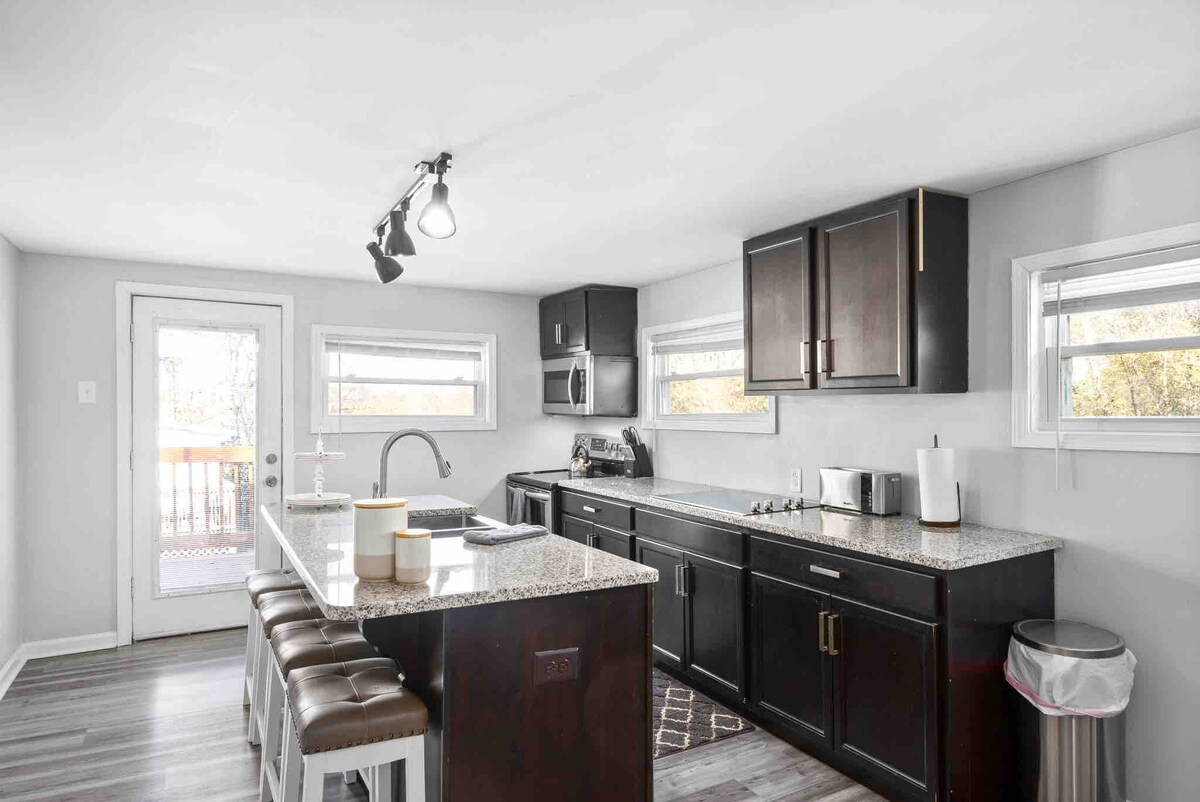 ➡️Nikmati gabungan sempurna reka bentuk moden dan pesona selesa di rumah 2 bilik tidur, 1 bilik mandi Downtown Clarksville ini yang terletak dalam jarak berjalan kaki dari Austin Peay, Downtown Clarksville, Riverwalk, dan F&M Bank Arena | Gelanggang Hoki Ais. Bas Transit Clarksville mempunyai perhentian yang terletak di hujung jalan untuk mereka yang lebih suka menaiki bas. Memuatkan sehingga 5 orang dengan katil queen, katil penuh dan sofa. Nikmati ruang tamu yang bergaya, dapur yang dilengkapi dengan kemudahan, mesin basuh/pengering, Wi-Fi percuma dan tempat letak kereta.
