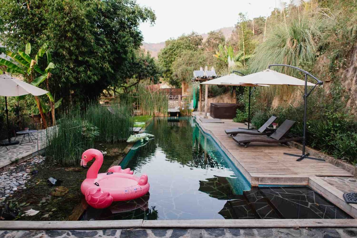 Terletak di tempat perlindungan kami dengan pemandangan gunung yang luar biasa di dalam taman semula jadi 40 hektar kami, syurga ladang organik seluas 6000m2 dan penanaman agave. Alami keajaiban alam mimpi di mana keindahan, ekosistem, biodiversiti, dan permakultur yang bersih bersatu dengan lancar. Sesuai untuk pasangan , pencinta alam semula jadi, pengembara, penulis, pelukis dan keluarga, di Ranch you rest with the sounds of the sanctuary, walk along the river, reconnect with yourself.