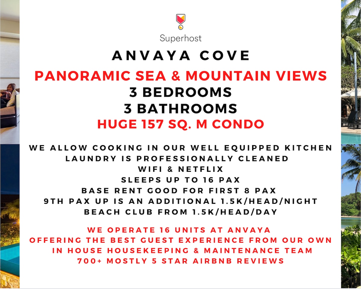 I’m a Superhost with 700+ reviews ✓ We live at Anvaya ensuring your stay is seamless ★ Super clean unit with professional laundry ★ Cooking Allowed ★ WiFi/Netflix ★ Base rate good for up to 5 pax ★ Additional pax @ 1.5k/head/night ★ Beach Club entry from 1.5k/head/day - only paid on days you actually enter the club ★ Beach Club now managed directly by Ayala Hospitality ★ New Head Chef who trained at Enderun ★ Makes a great base to also explore Zoobic Safari, Ocean Adventure & Las Casas Filipinas