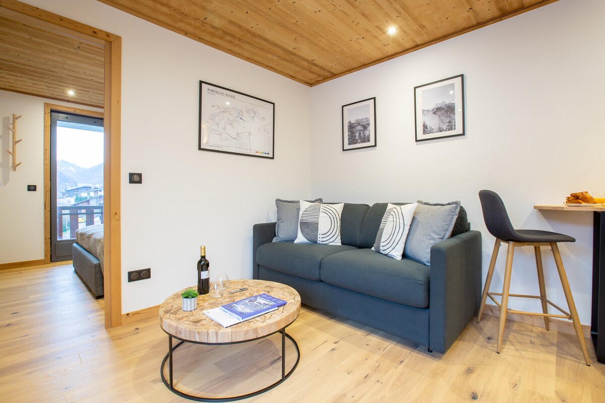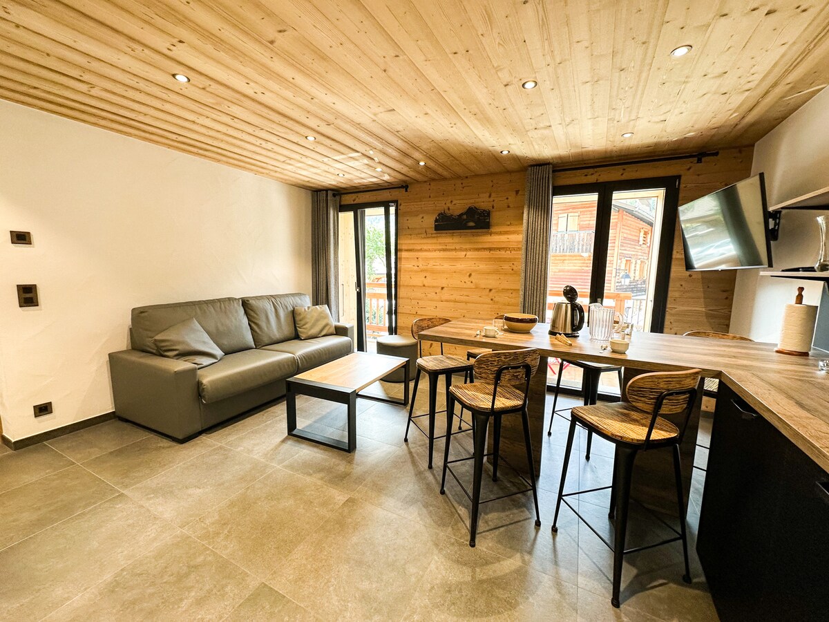 Nikmati pengalaman bergaya di apartmen baharu yang terletak di pusat bandar ini di sebelah Pleney Lift. Ski masuk - Ski keluar! Lokasi yang sempurna untuk bar, restoran & kedai yang sangat baik. Tambahan garaj bawah tanah persendirian yang selamat untuk basikal atau kereta bersaiz kecil/sederhana. Menempatkan 6 orang: dua bilik tidur (berasingan atau berganda), "Coin Nuit" dengan katil dua tingkat saiz dewasa dan pintu gelangsar. Ruang tamu pelan terbuka mempunyai dapur lengkap, meja makan dan kerusi, kawasan TV dan wifi. Katil yang selesa untuk tidur malam yang sempurna.