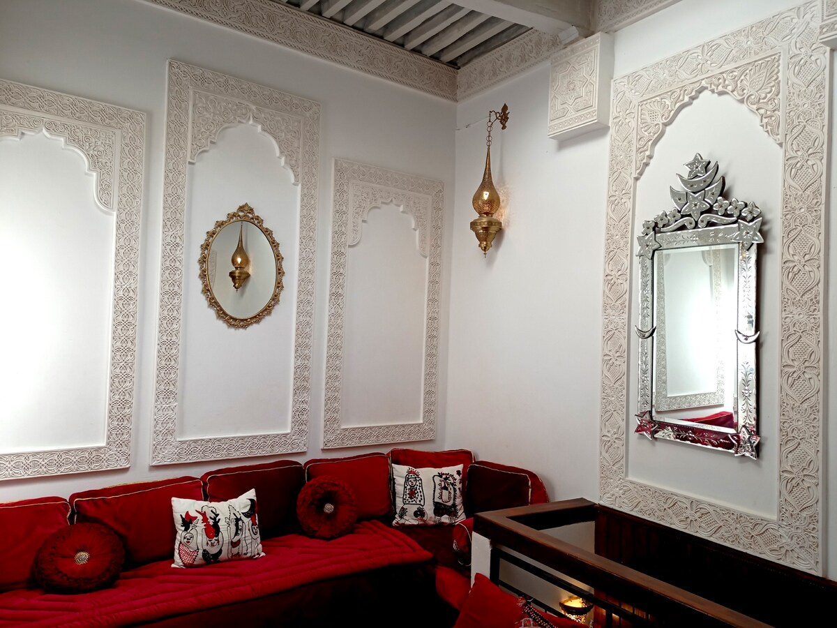 Apartmen tradisional tingkat pertama yang luas dengan sentuhan moden. Menampilkan Wi-Fi gentian optik (100 Mbps) yang sesuai untuk kerja jarak jauh (meja/kerusi atas permintaan), TV pintar, pendingin/penghangat, dan air panas. Terletak di tengah-tengah, hanya 4 minit berjalan kaki ke Bab Boujloud, Talaa Sghira, dan Talaa Kbira, teksi, tempat letak kereta berbayar dan tarikan lain. Nikmati gabungan tradisi dan keselesaan. Tidak sesuai jika anda sensitif kepada bunyi bising.