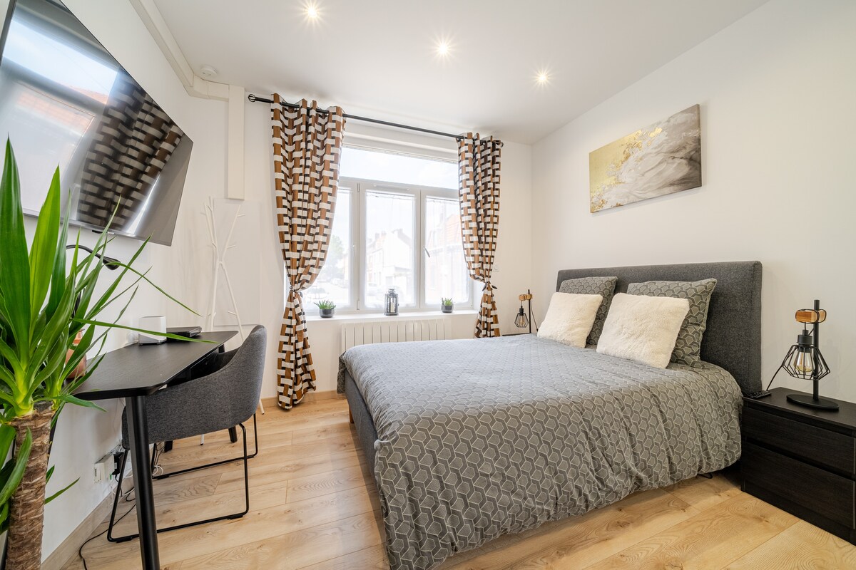 Flat 4 bintang pertama Tourcoing. - Di tengah-tengah kawasan metropolitan Lille, di daerah Ma Campagne di Tourcoing, apartmen studio yang hebat ini didedikasikan kepada pengembara profesional yang mencari ketenangan dan ketenteraman dan biasa dengan tahap perkhidmatan yang cemerlang. - 1 katil queen. - 1 bilik dengan pancuran mandian walk-in. - Ruang dapur - Balkoni dengan pemandangan taman. - Parkir tetamu - Stesen tram 'Ma Campagne’ 2 minit berjalan kaki