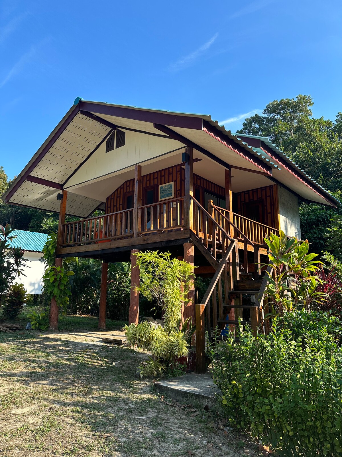 Ini adalah banglo terbaik kami kerana ia mempunyai bilik rehat tambahan dengan tilam di mana anda boleh berehat di hadapan taman tropika. - Penyaman udara tersedia atas permintaan (kira-kira 20฿ sejam) - Sarapan popular juga tersedia pada harga istimewa 150฿ setiap satu (kira-kira 4€) lihat menu dalam gambar Sila hantar mesej kepada kami jika anda memerlukannya