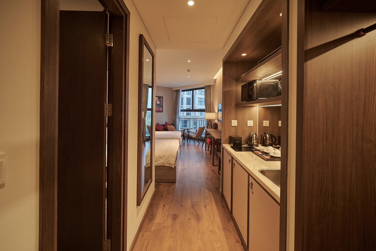 Apartmen studio 32m2 dengan perabot mewah dengan kemudahan penuh termasuk: * 1 katil besar 1m8 cadar penuh dan cadar. * 1 bilik tandas & bilik mandi moden disediakan tuala, syampu, gel mandi, pengering rambut… * 1 rak dapur kecil dilengkapi dengan ketuhar gelombang mikro, dandang, peti sejuk mini ( tiada sokongan memasak di apartmen, hanya boleh memanaskan semula makanan) * Almari gantung, meja kerja, televisyen, wifi Tingkap besar, pemandangan tinggi ke laut sangat indah