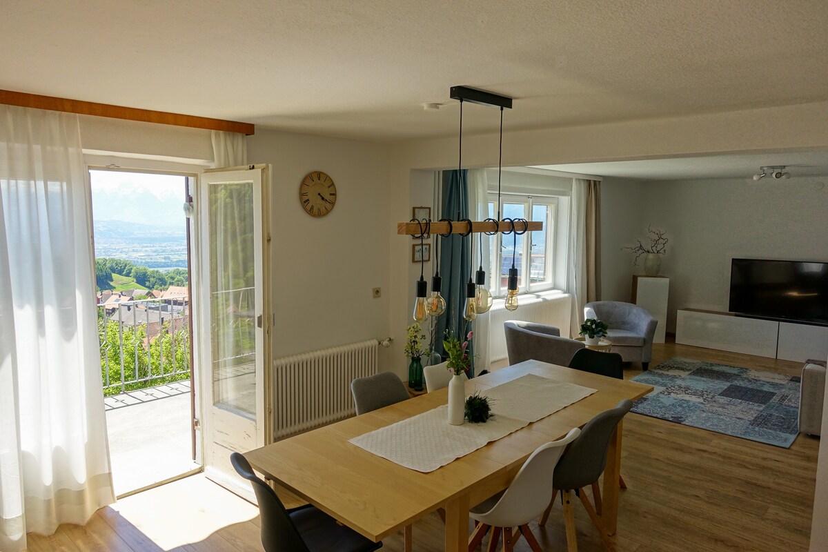 Urlaub in den Alpen Unsere neu renovierte Ferienwohnung in den Bergen (1000 m ü. A.) stellt für jede/n eine warme und mit viel Liebe zum Detail eingerichtete Bleibe zum vernünftigen Preis dar. Im selben Haus gibt es noch eine weitere, komplett getrennte Wohnung, die ebenfalls gemietet werden kann. Die Wohnung selbst ist von außen schlecht einsehbar. Der Ausblick auf die Schweizer Berge ist fantastisch. Abendrot geniessen oder am Beamer einen Film geniessen.