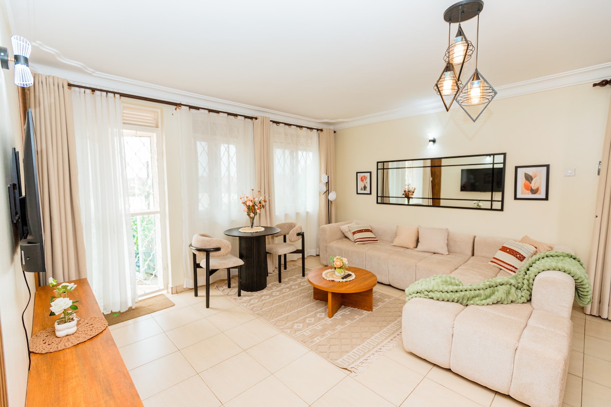 Apartmen 1 bilik tidur yang selesa di Kyanja, 52sqm dengan kemudahan moden! Nikmati dapur yang lengkap, bilik tidur yang selesa, dan bilik mandi yang anggun. Bersantai di ruang tamu atau nikmati pemandangan dari balkoni. Kemudahan termasuk WiFi, DStv, tempat letak kereta yang selamat, dan keselamatan 24/7. Berdekatan dengan kedai dan restoran. Sesuai untuk pengembara solo atau pasangan!
