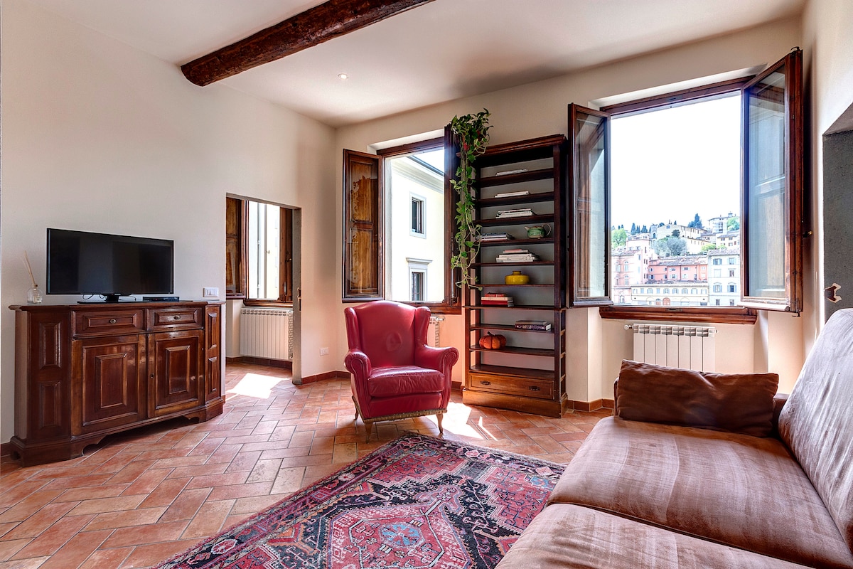 Apartmen kecil yang indah ini terletak di tingkat atas bangunan bersebelahan dengan Ponte Vecchio. Pusat Florence berada di bawah anda; sebaik sahaja anda keluar dari pintu depan anda akan mendapati diri anda beberapa meter dari Piazza Signoria yang indah atau Katedral Duomo yang mengagumkan dan berjalan kaki 10 minit dari stesen pusat Santa Maria Novella. Dari teres kami sambil menghirup segelas wain, anda akan menikmati pemandangan unik bandar kami di hadapan anda!